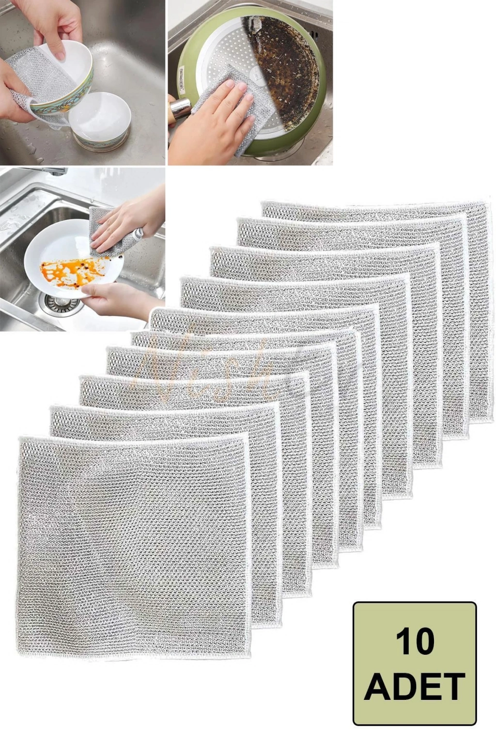 Ebat: 20x20 cm; Nishev 10 adet Çok Fonksiyonlu Çizilmez Tel Bulaşık Bezi - Zor Kir Bezi, Mutfak Banyo Bezi Çift Katlı Çok Amaçlı Çelik Tel Bez.; Güçlü Temizleme Etkisi: Metal Tel Bulaşık Bezlerimizle inatçı lekelere veda edin.; Çelik tel yapısı, derinlemesine ve etkili bir temizlik sağlayarak bulaşıklarınızın pırıl pırıl ve lekesiz kalmasını sağlar.; Çok Amaçlı ve Kullanımı Kolay: Çok Amaçlı Tel Bulaşık Yıkama Bezlerimiz her evde bulunması gereken bir şeydir.; İster tencere ve tavaları fırçalıyor ister arabanızı temizliyor olun, dayanıklılığı ve çok yönlülüğü onu temizlik arkadaşınız haline getiriyor.; Diğer ürünlerimiz için profilimizi ziyaret edebilirsiniz.;