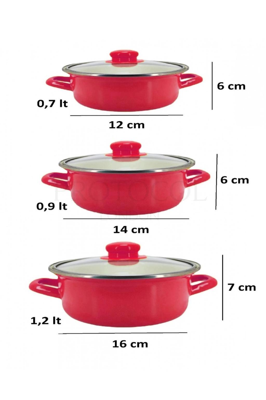Protocol London 12/14/16 cm Mini Emaye Tencere Seti - Kırmızı ; 12 cm Tencere 0,7 lt + Cam Kapak ; 14 cm Tencere 0,9 lt + Cam Kapak ; 16 cm Tencere 1,2 lt + Cam Kapak ; Emaye Tencere Setiyle hem ocağınızda hem de odun veya kömür ateşinde ürünlerinizi pişirebilirsiniz. ; Bulaşık makinesinde yıkanır, camsı yapısı sayesinde pratik ve kolay temizlenir. ; Bütün ısı kaynaklarında kullanılabilir. Elektrikli, gazlı, camlı, seramik kaplamalı, endüksiyonlu vb. tüm ocak tiplerinde kullanıma uygundur. ; Yapay hiçbir element kullanılmaması ise emayelerin % 100 geri dönüştürülebilir olmasını sağlar. Bu sayede çevre dostu bir malzeme satın almış olursunuz. ; Emaye kaplamalar anti-bakteriyeldir ve kanserojen madde içermez. Camsı yapısı bakterilerin ürüne yapışmasına engel olur. Doğal hammaddelerin yüksek derecede pişirilmesi sonucu bileşenler arası boşluk azalır ve bakterilerin ürünün içine nüfus etmesi engellenir. ;