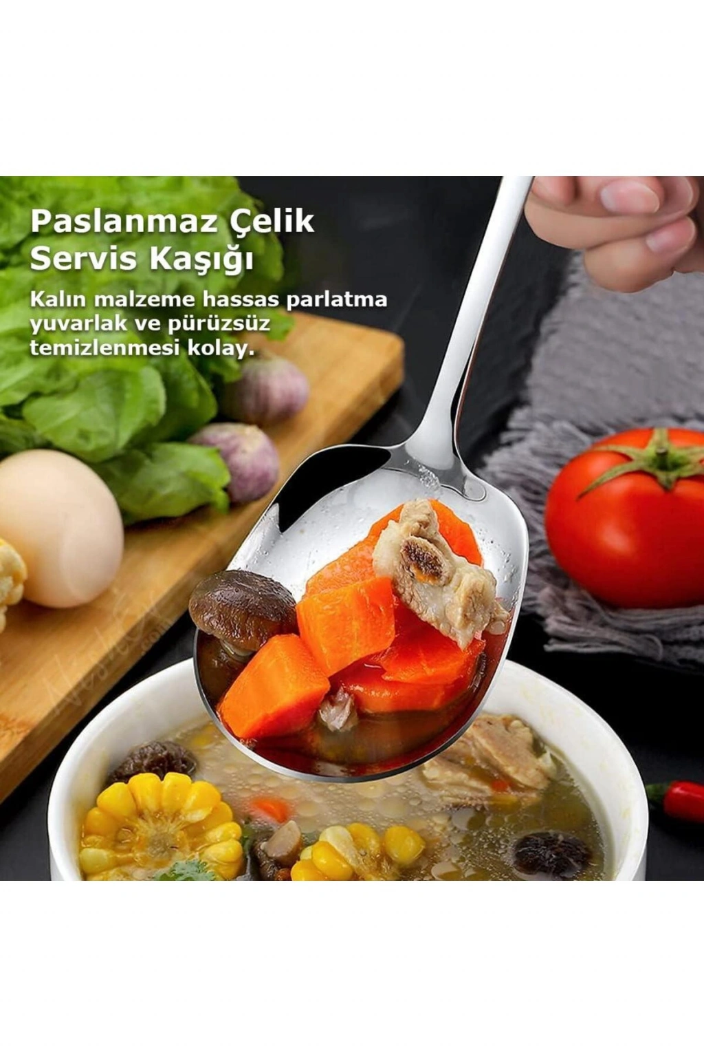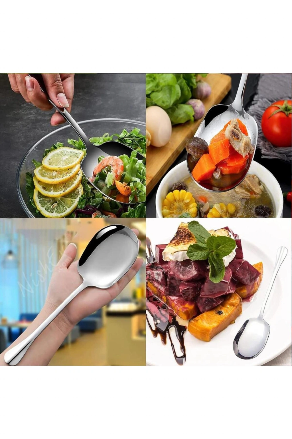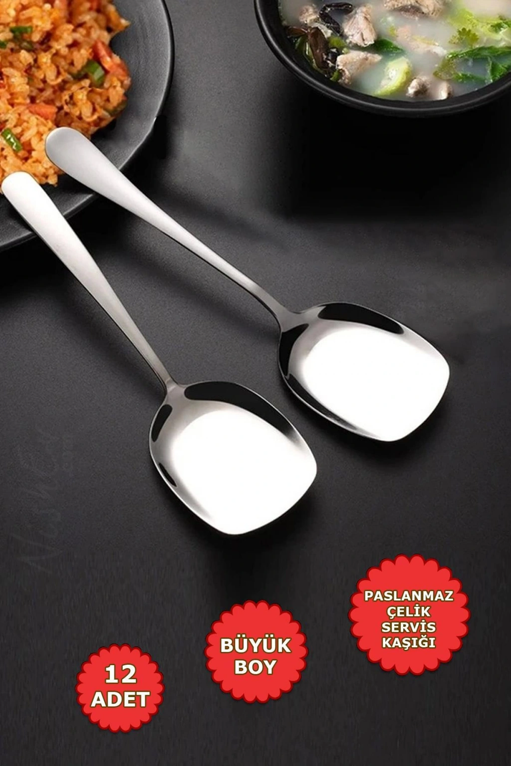 Nishev 12'lı Lüks Servis Kaşığı Seti Büyük Boy Paslanmaz Çelik Kaşık Salata Pasta Yemek Servis Mutfak Kaşığı; 12 Adet Paslanmaz Lüx Çelik Servis Kaşığı Ürün Bilgisi; Paket İçeriği: 12 Adet Lüx Paslanmaz Servis Kaşığı; Ebat Uzunluk: 21 cm En: 6 cm; Servis Kaşığı Seti, yemek servisi yaparken kullanabileceğiniz 12 adet paslanmaz çelik kaşık içeren bir settir. Paslanmaz çelik malzeme, ürünün dayanıklı, sağlam ve uzun ömürlü olmasını sağlar.; Bu servis kaşıkları özellikle salata, börek, pasta, fırın, tavuk ve patates gibi yemeklerin sunumunda kullanılmak üzere tasarlanmıştır.; Her bir kaşık, farklı boyutlarda ve şekillerde olup, çeşitli yemekleri kolayca servis etmenizi sağlar.; Servis kaşıkları, lüks bir sunum için idealdir ve sofranızın şıklığını tamamlayacak bir görünüme sahiptir.; Ayrıca, ürünün kolay kullanım ve temizliği de dikkat çekicidir. Servis Kaşığı Seti, evde yemek servisi yaparken kullanabileceğiniz şık ve kullanışlı bir üründür.; Ürünün kalitesi ve dayanıklılığı, uzun yıllar boyunca keyifle kullanmanızı sağlayacak.; Diğer ürünlerimiz için profilimizi ziyaret edebilirsiniz.;