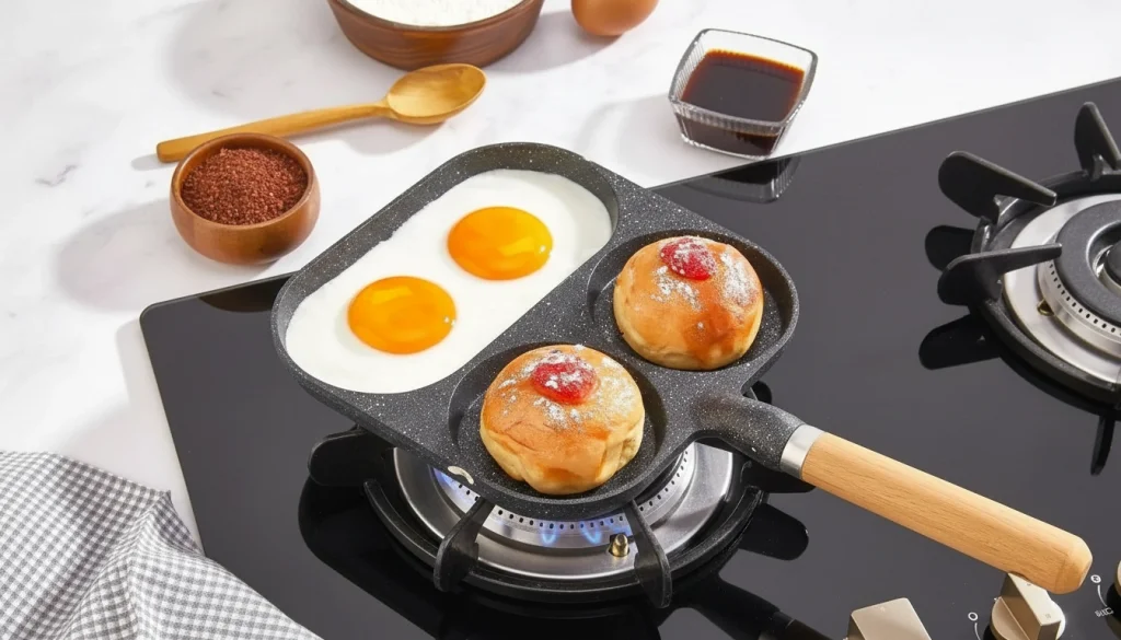 Granit iç ve dış yüzeyi sayesinde yüksek ısı dağılımı sağlar, eşit pişirme ve mükemmel lezzet sonuçları elde etmenize yardımcı olur; Üç bölmeli tasarımı ile farklı yemekleri aynı anda pişirme imkanı sunar; pancake, yumurta ve mücver gibi çeşitli tarifler için idealdir; Granit malzemesi sayesinde uzun ömürlü kullanım ve kolay temizlik sağlar; yapışmaz yüzeyi ile pişirme sırasında kolaylık sunar;