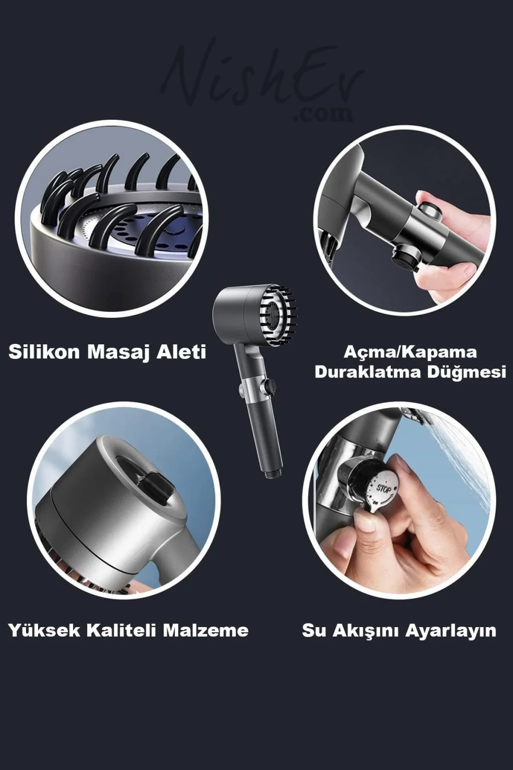 - Dört şık mod: Yağmur, Sprey, Sis ve Yüksek Basınç – her ihtiyaca uygun su akışı.
