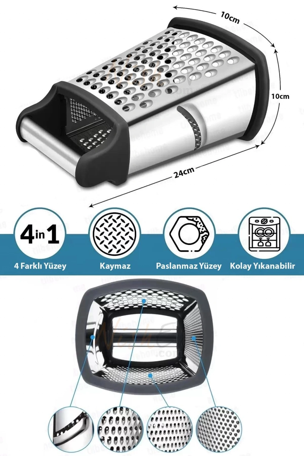 Nishev 4 Fonksiyonlu Orta Boy Çelik El Rende Silikon Tabanlı Sarımsak Kereviz Peynir Sebze Doğrayıcı Rende; Gövde Malzemesi: Paslanmaz Çelik; Ürün Ölçüleri: 24 cm x 10 cm 10 cm; Renk: Metalik; Model: Multi Fonksiyonel; Özellik: 4 Fonksiyonlu; Paket İçeriği: 1 Adet 4 Fonksiyonlu Çelik Rende Bulunmaktadır.; DETAYLI ÜRÜN AÇIKLAMASI; 4 Fonksiyonlu rende paslanmaz çelikten yapılmıştır. Temizlemesi kolay, elde yıkanabilir ve bulaşık makinesinde yıkanabilir.; Paslanmaz çelik bıçaklar işlemi kolaylaştırır ve ayrıca dilimleyicinin çok uzun ömürlü olmasını sağlar.; Kompakt tasarımı ile güvenli ve pratik kullanım imkânı sunar; Bu durumda mutlaka mutfağımızda bulunması gereken araçların en başında gelmektedir.; Rende kullanımı oldukça rahat ve pratik bir üründür.; Ev, restoran vb. ihtiyaç duyulan alanlarda rahatlıkla kullanabilirsiniz.; Şeflerin kullandığı tarzda kaliteli ve tutuş kolaylığı ile mutfakta zaman kazanın.; Paslanmaz çelik malzemeden üretilmiş olması sebebiyle uzun yıllar dayanıklılığını korur.; Diğer ürünlerimiz için profilimizi ziyaret edebilirsiniz.;
