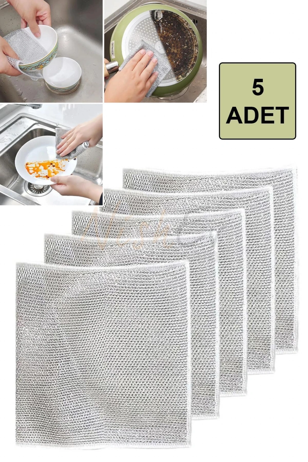 Ebat: 20x20 cm; Nishev 5 adet Çok Fonksiyonlu Çizilmez Tel Bulaşık Bezi - Zor Kir Bezi, Mutfak Banyo Bezi Çift Katlı Çok Amaçlı Çelik Tel Bez.; Güçlü Temizleme Etkisi: Metal Tel Bulaşık Bezlerimizle inatçı lekelere veda edin.; Çelik tel yapısı, derinlemesine ve etkili bir temizlik sağlayarak bulaşıklarınızın pırıl pırıl ve lekesiz kalmasını sağlar.; Çok Amaçlı ve Kullanımı Kolay: Çok Amaçlı Tel Bulaşık Yıkama Bezlerimiz her evde bulunması gereken bir şeydir.; İster tencere ve tavaları fırçalıyor ister arabanızı temizliyor olun, dayanıklılığı ve çok yönlülüğü onu temizlik arkadaşınız haline getiriyor.; Diğer ürünlerimiz için profilimizi ziyaret edebilirsiniz.;