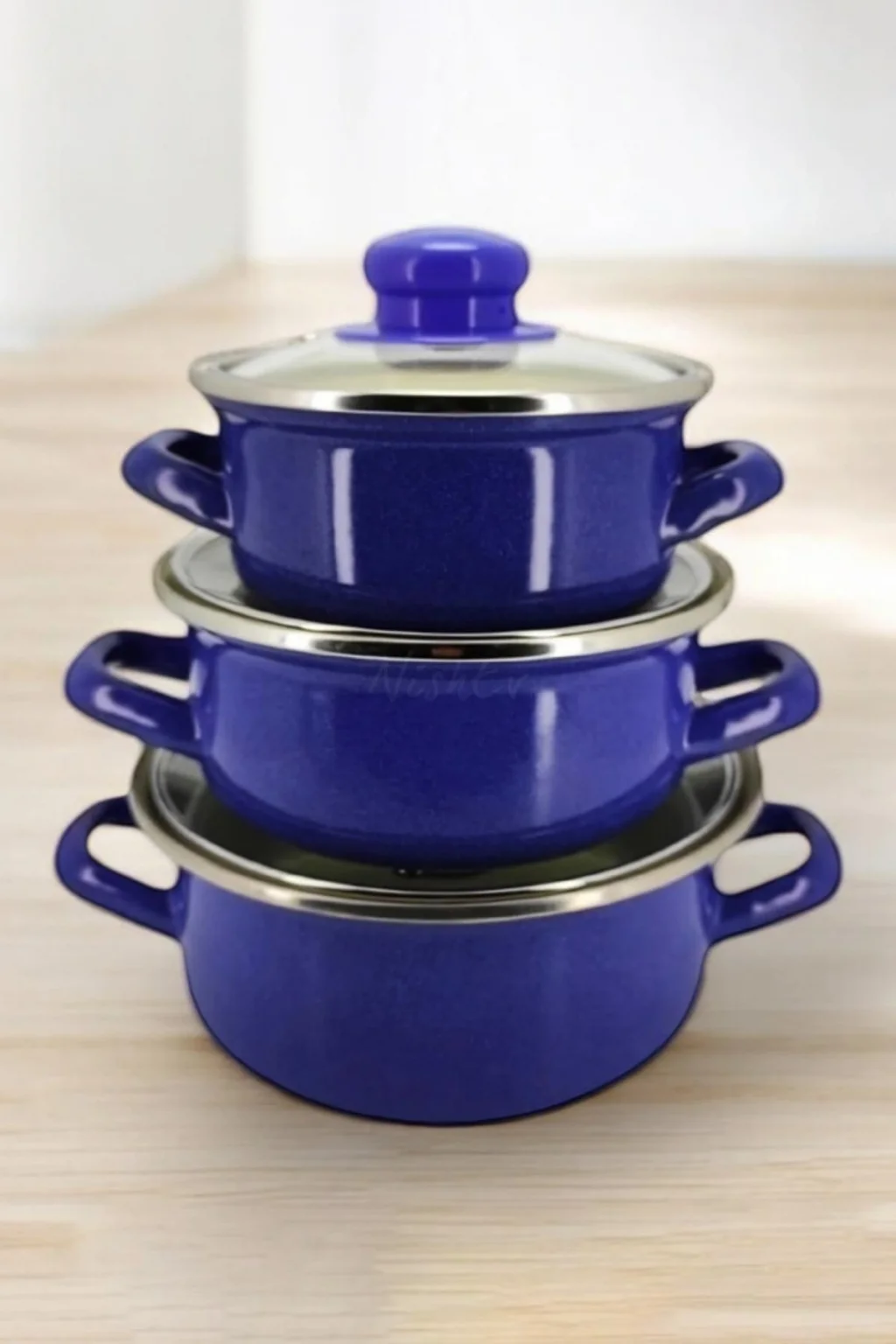 6 parça, 12/14/16 cm mavi emaye tencere seti, cam kapaklı, bulaşık makinesi ile temizlenebilir.