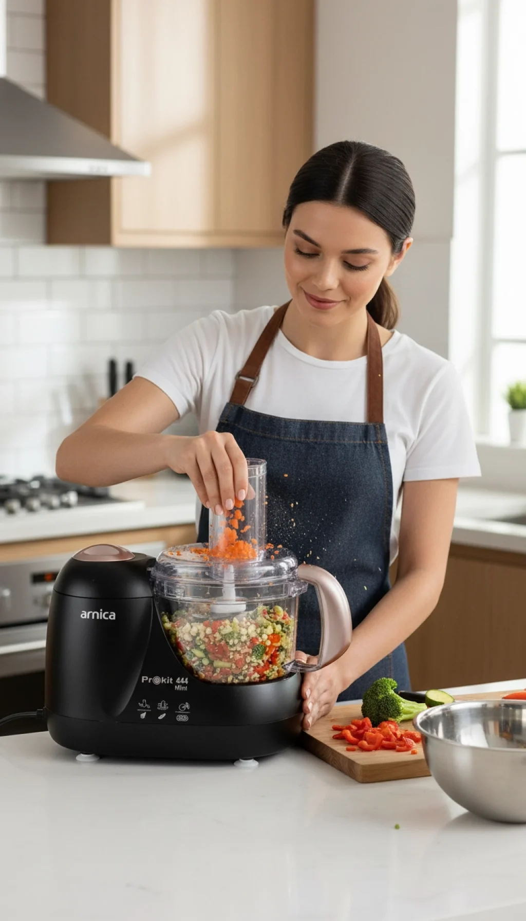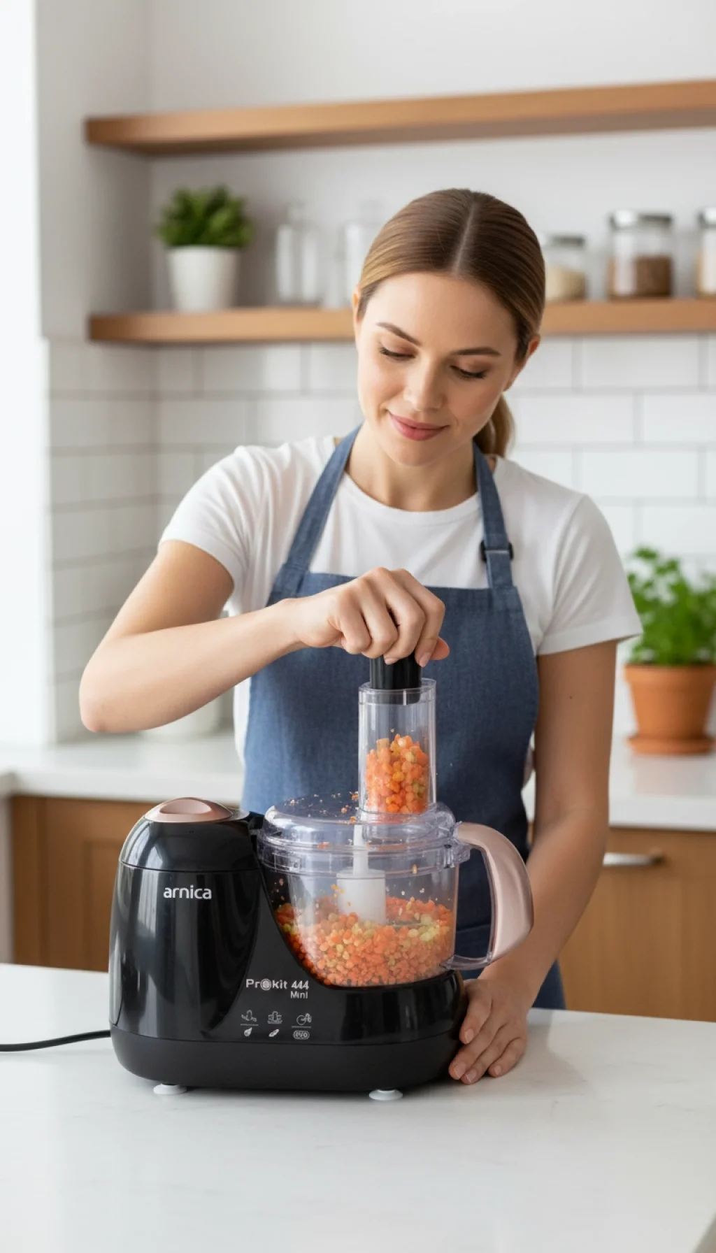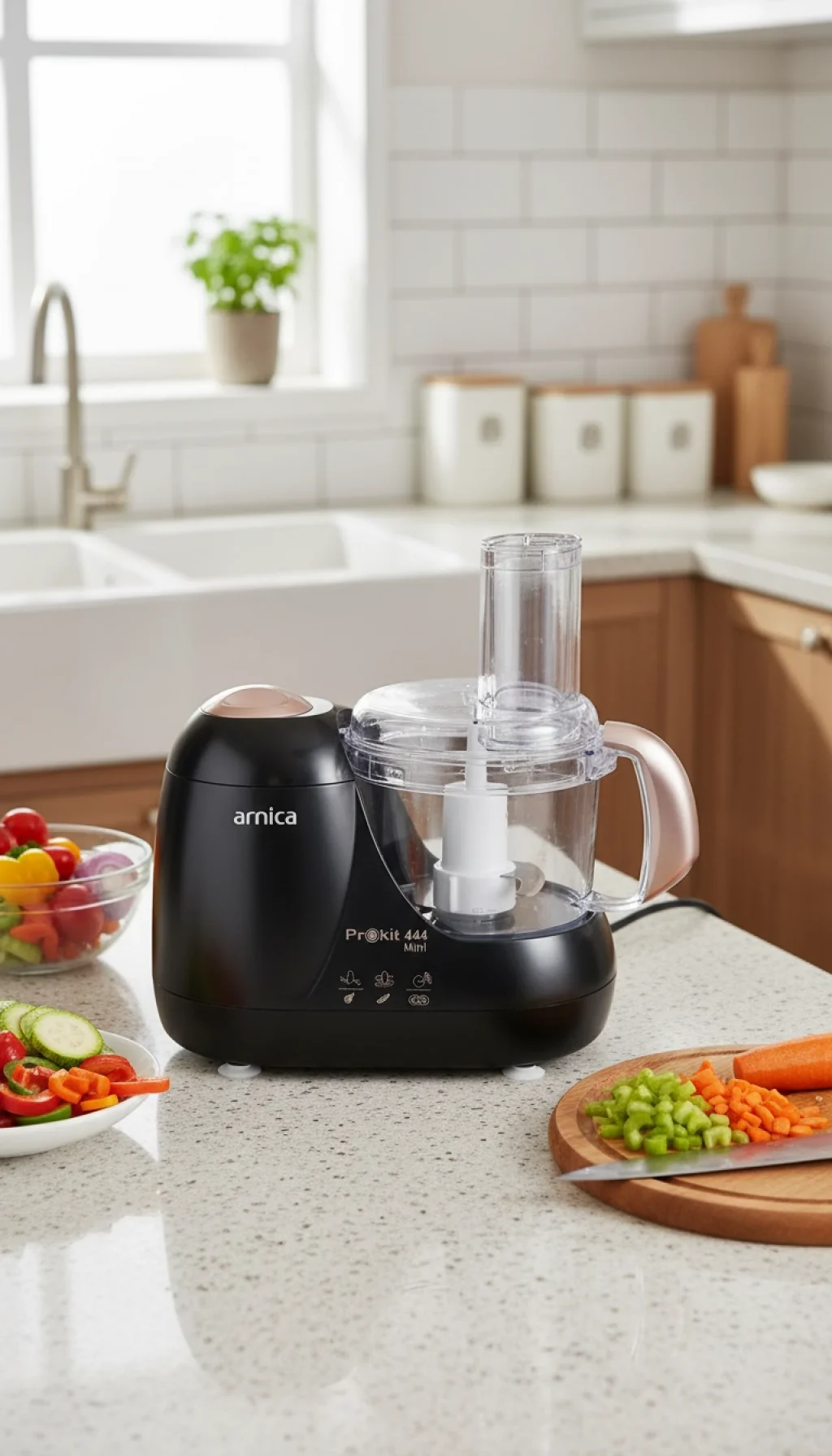 Mutfakta yer kaplamayan ama işlevselliğiyle harikalar yaratan bir yardımcı mı arıyorsunuz? Arnica Prokit 444 Mini, şık siyah ve rose gold detaylarıyla mutfağınıza estetik katarken, güçlü motoruyla yemek hazırlama sürecinizi saniyeler içinde tamamlamanızı sağlar. Özellikle dar alanlar ve pratik çözümler arayanlar için Nishev koleksiyonunun en akıllıca seçimlerinden biri.