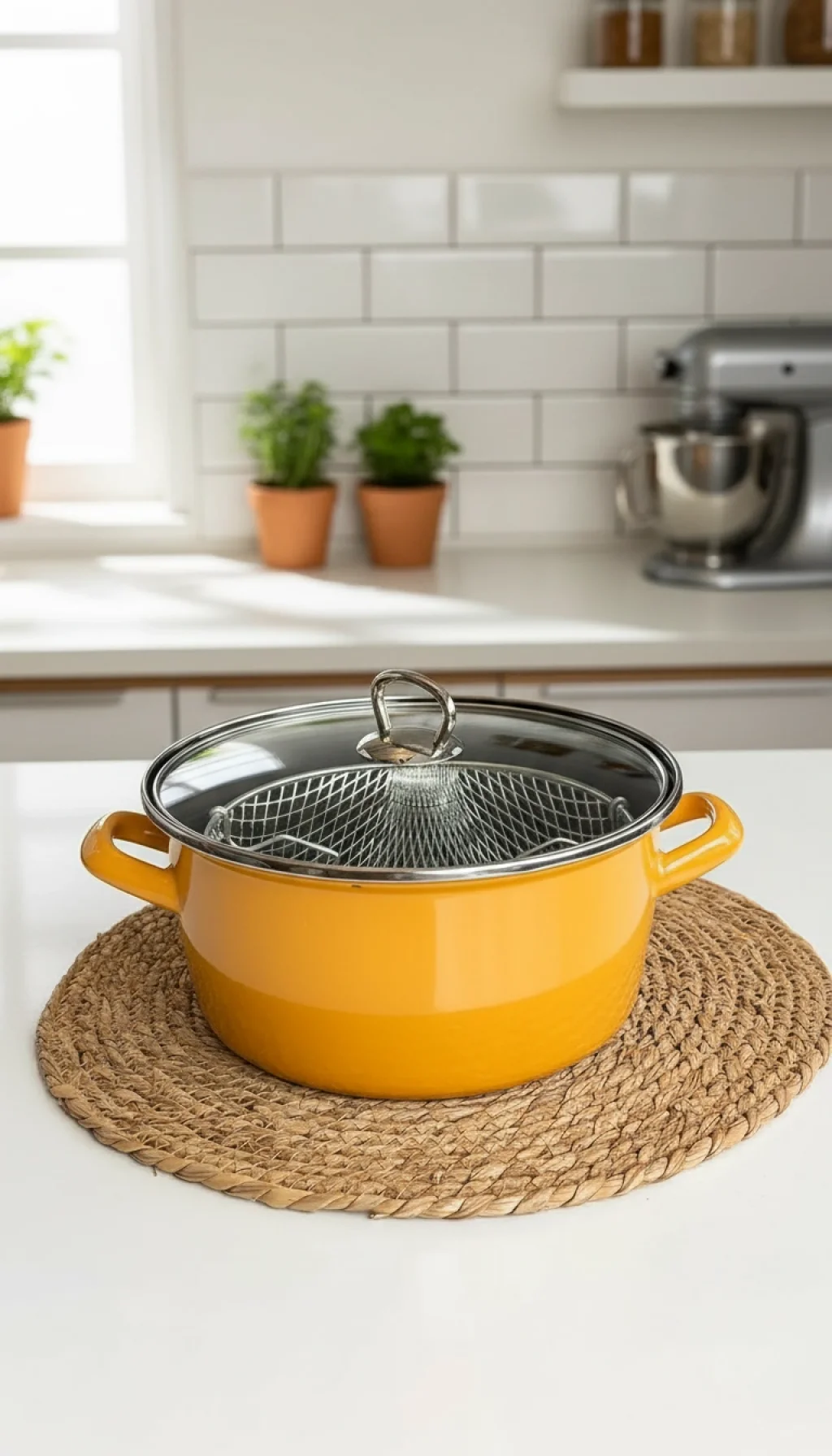 Editörün Notu: Bu canlı sarı tencereyi açık renkli mutfak tezgahlarında kullanarak mutfağınızın odak noktası haline getirebilirsiniz. Hem ocak üstünde hem de sunumda fark yaratır!