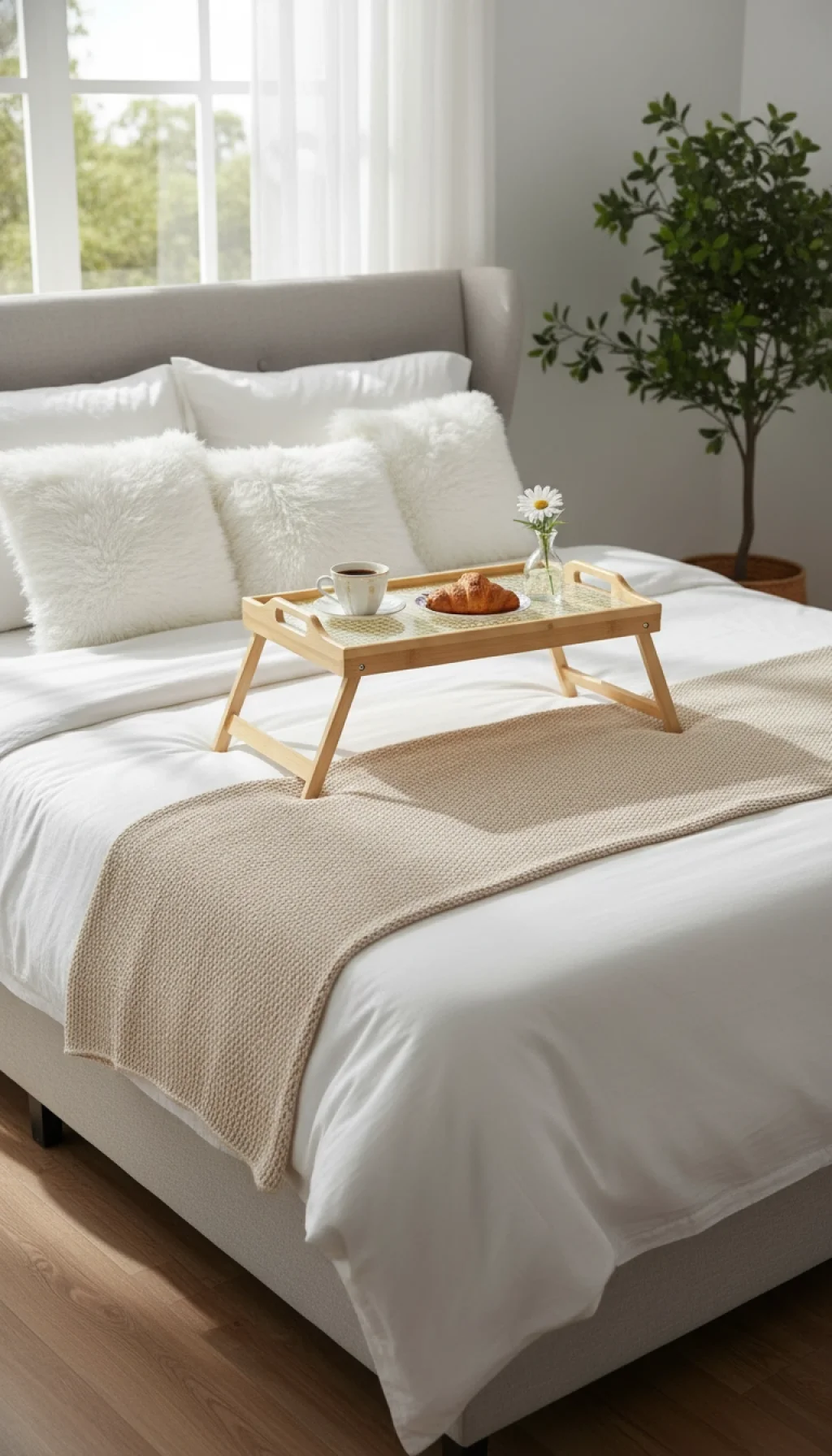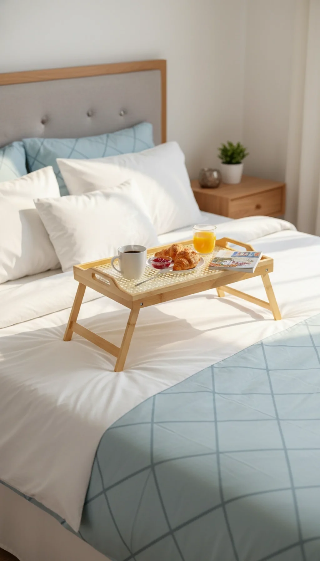 Bu portatif tepsi, evinizdeki herhangi bir odada rahatça kullanılabilir ve misafirlerinize şıklığıyla hizmet sunmanızı sağlar. Lüks ve fonksiyonelliği bir araya getiren tasarımıyla yatak keyfinizi bir üst seviyeye taşıyın.