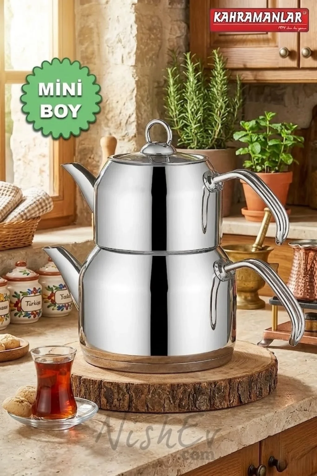 Bu özel set, modern mutfak dekorasyonunuza şıklık katan platin rengi kaplama ve çelikten üretilmiş dayanıklı yapısıyla öne çıkar. Mini boy tasarımı sayesinde yerden tasarruf ederken, tüm çay keyfinizi tek pakette toplar.