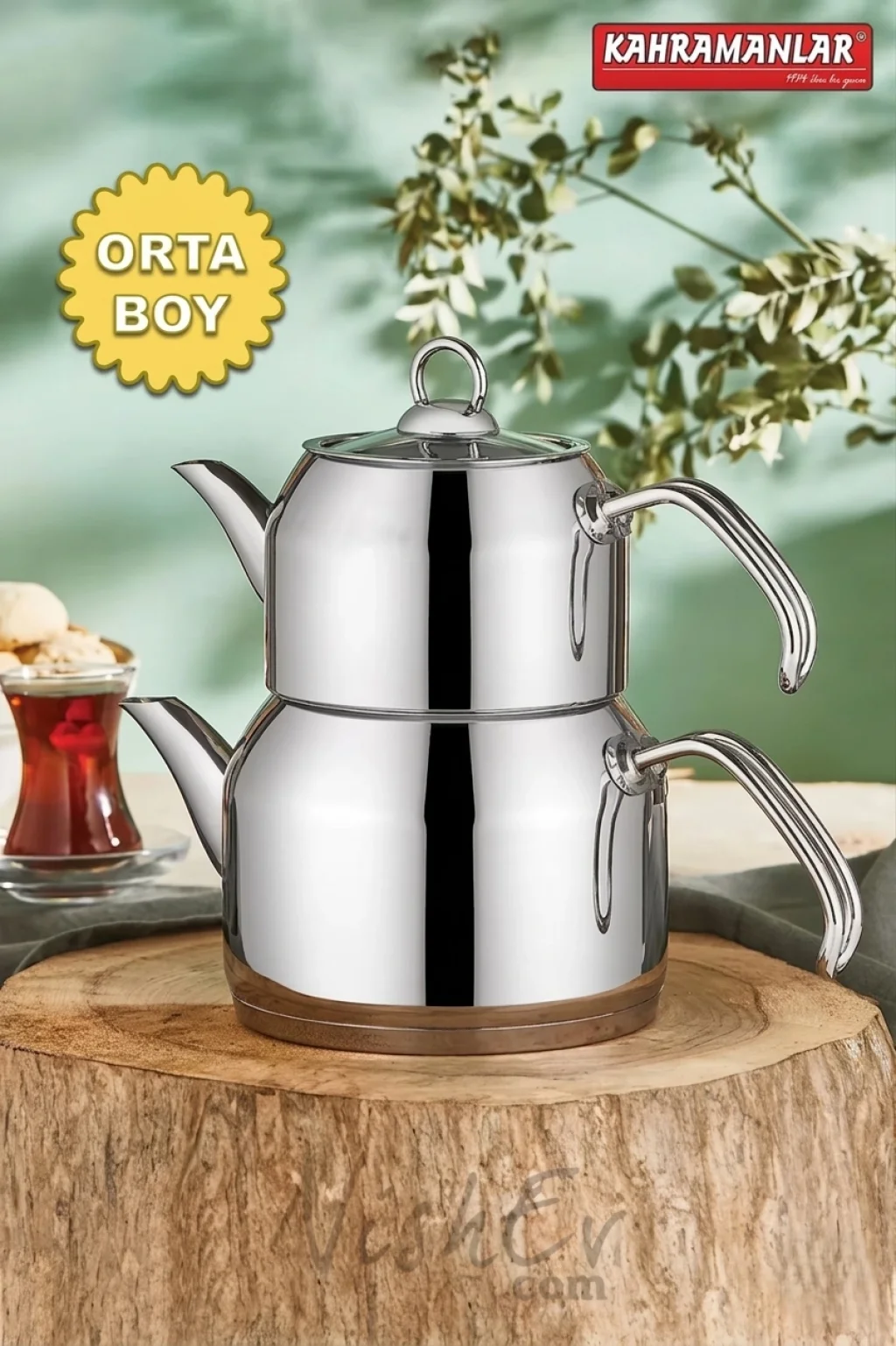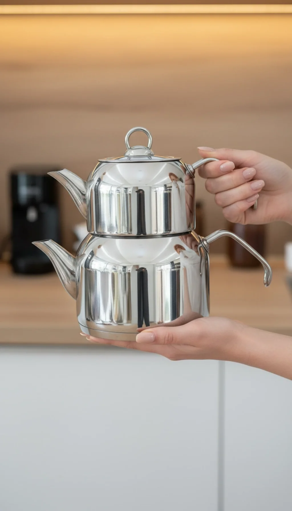 4 Parça Set: Üst demlik, alt suluk ve her iki bölme için uyumlu kapaklarla tam bir set olarak sunulur.