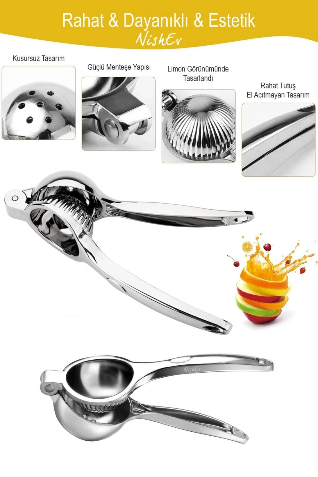 Gerçek döküm narenciye limon sıkacağı limonu ve diğer narenciyeleri hızlı, zahmetsiz şekilde sıkar salata, kokteyl ve sos hazırlamak ya da yemekleri lezzetlendirmek hiç bu kadar pratik olmamıştı.; ; Limon sıkacağı, döküm malzemesinden üretilmiş olup, uzun ömürlü ve dayanıklı bir kullanım sunar.; Bu sayede mutfakta sıkça kullanılan limon sıkacağı ihtiyacınızı karşılamak için idealdir.; ; Oldukça sağlam ve uzun ömürlüdür.; ; Renk : Gümüş; Malzeme: Döküm; Ölçüler : 22cm x 7cm x 4cm; Diğer ürünlerimiz için profilimizi ziyaret edebilirsiniz.