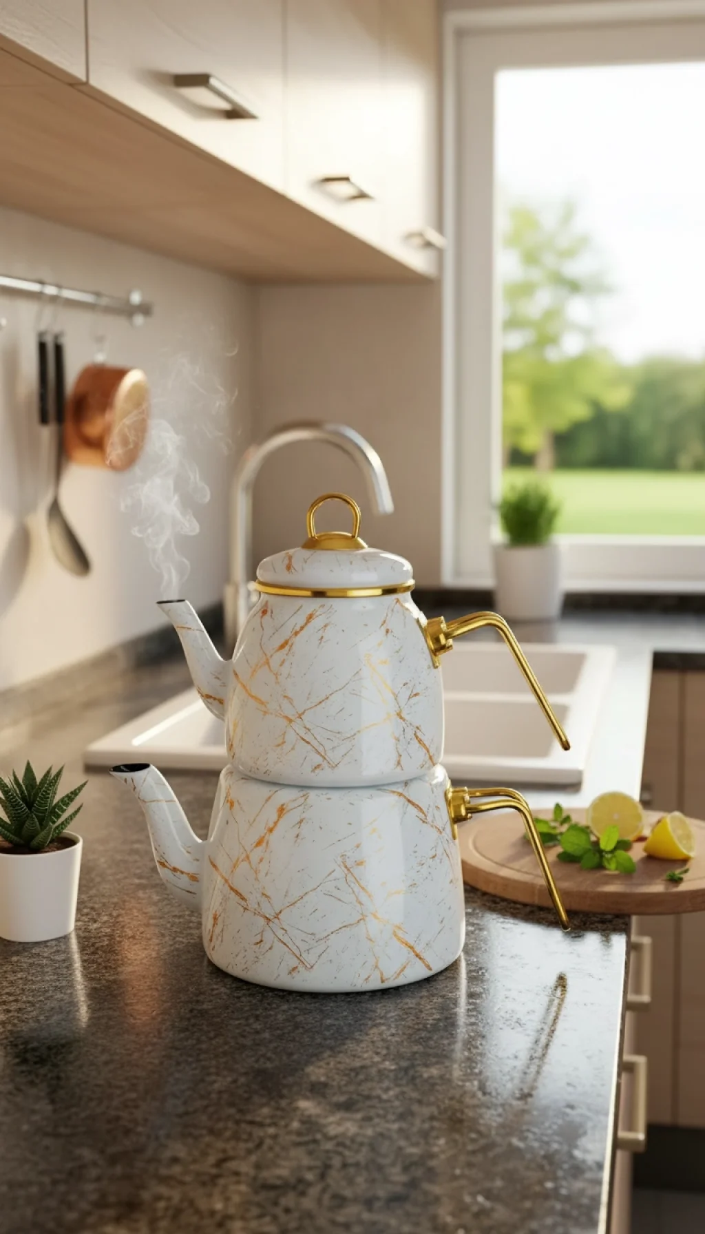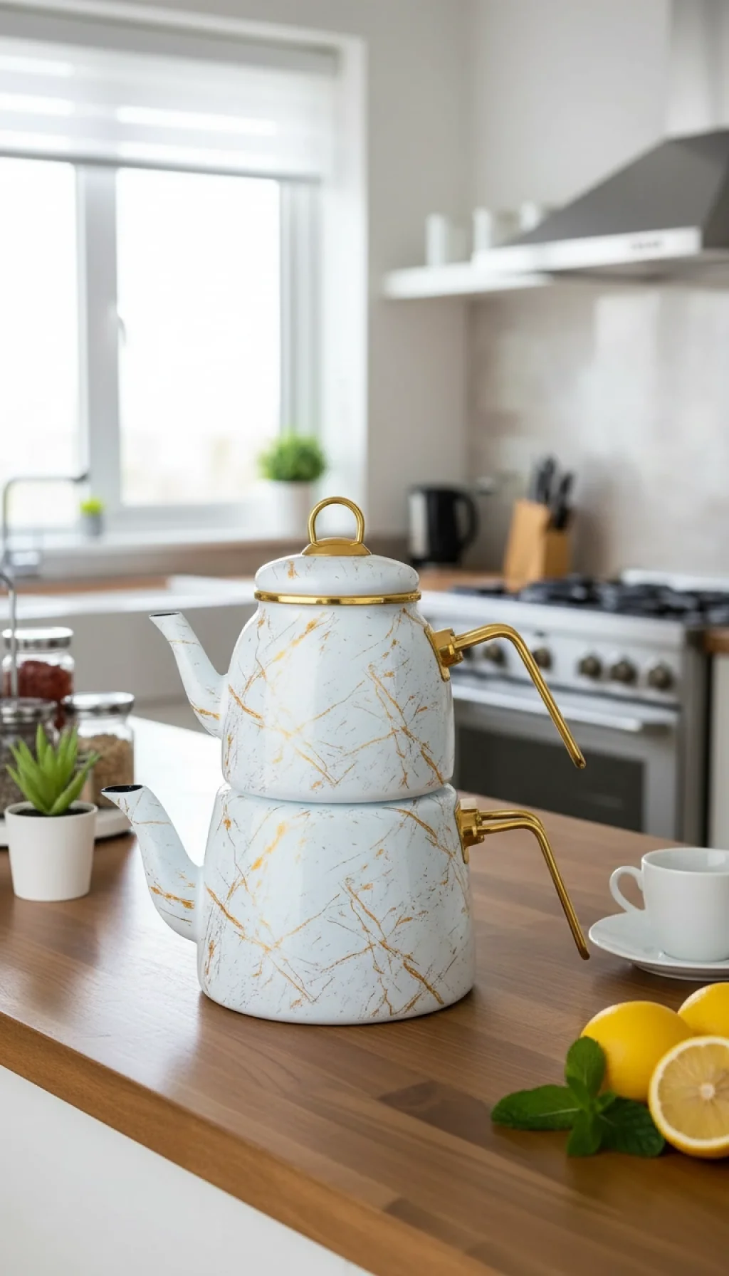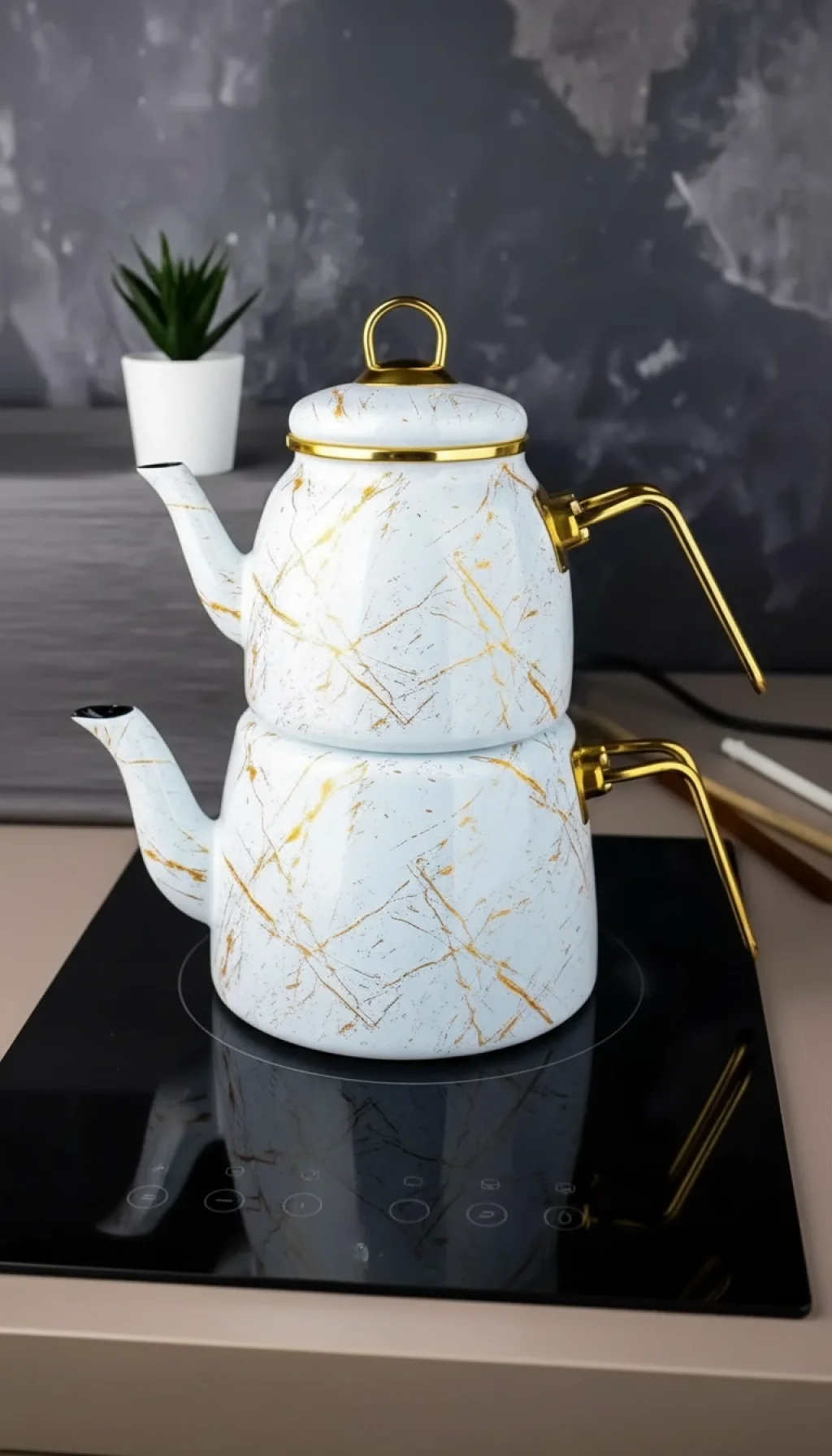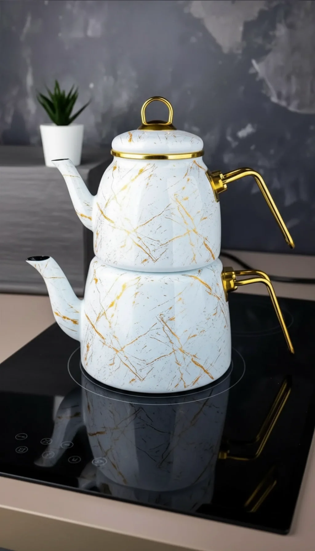 Modern tasarımı ve üstün emaye kaplamasıyla, bu çaydanlık seti uzun ömürlü kullanım ve zahmetsiz temizlik sunar.
