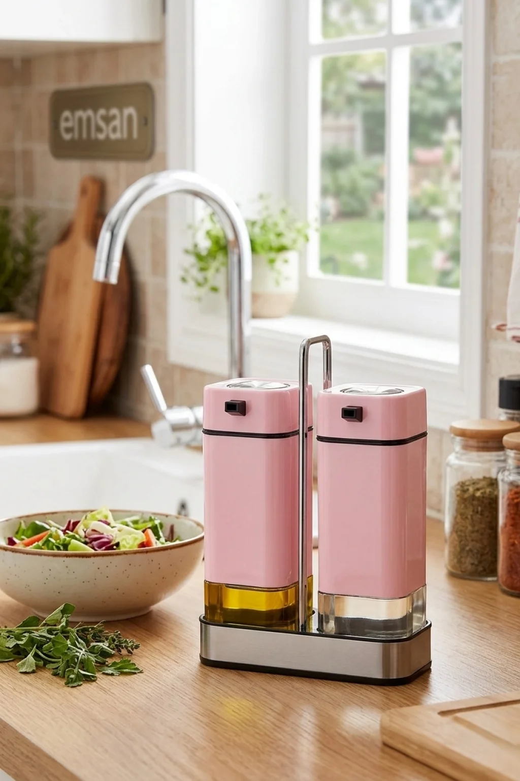 Emsan Plaza Elegance Baby Pink Standlı Yağlık & Sirkelik Seti, modern mutfak dekorasyonunu tamamlayan şık ve fonksiyonel tasarımıyla öne çıkar.
