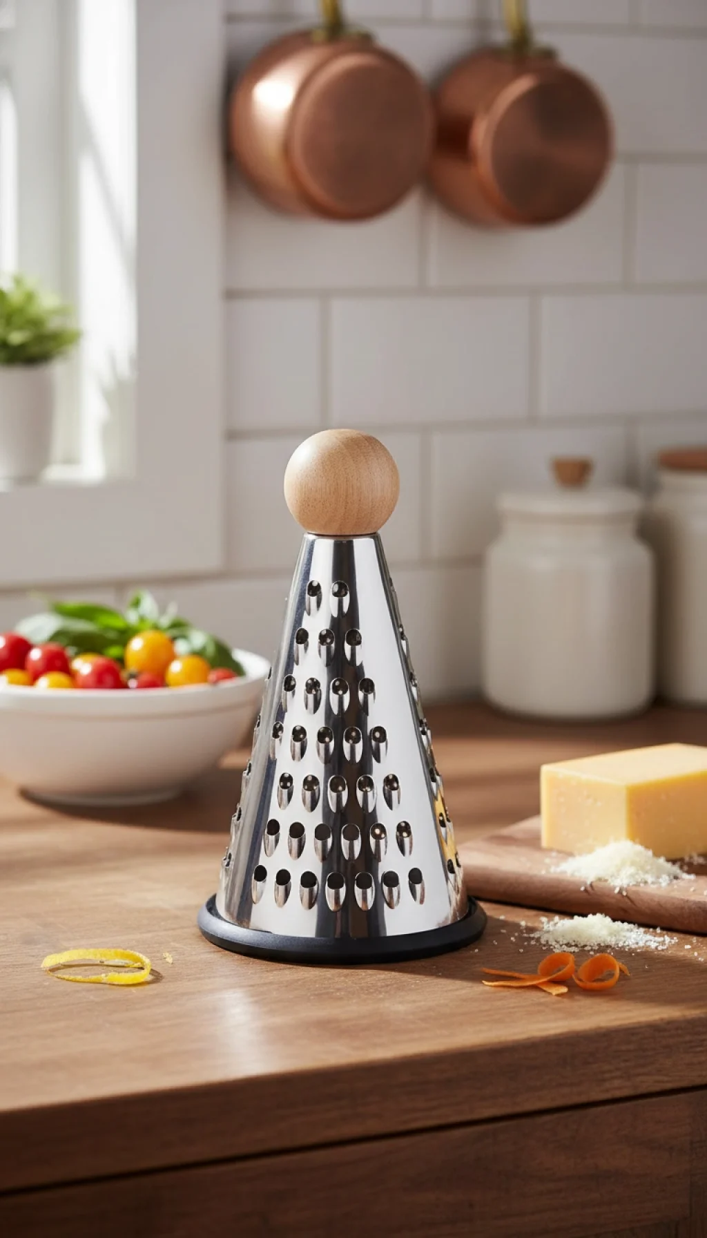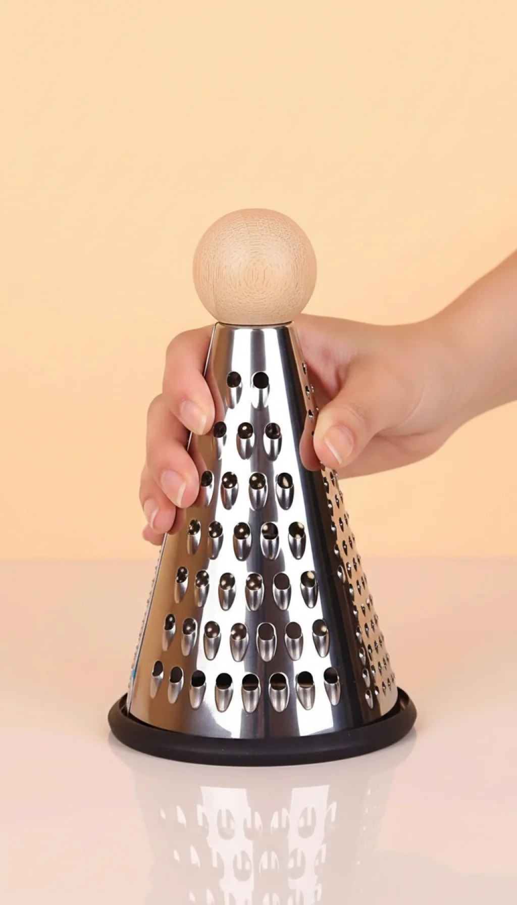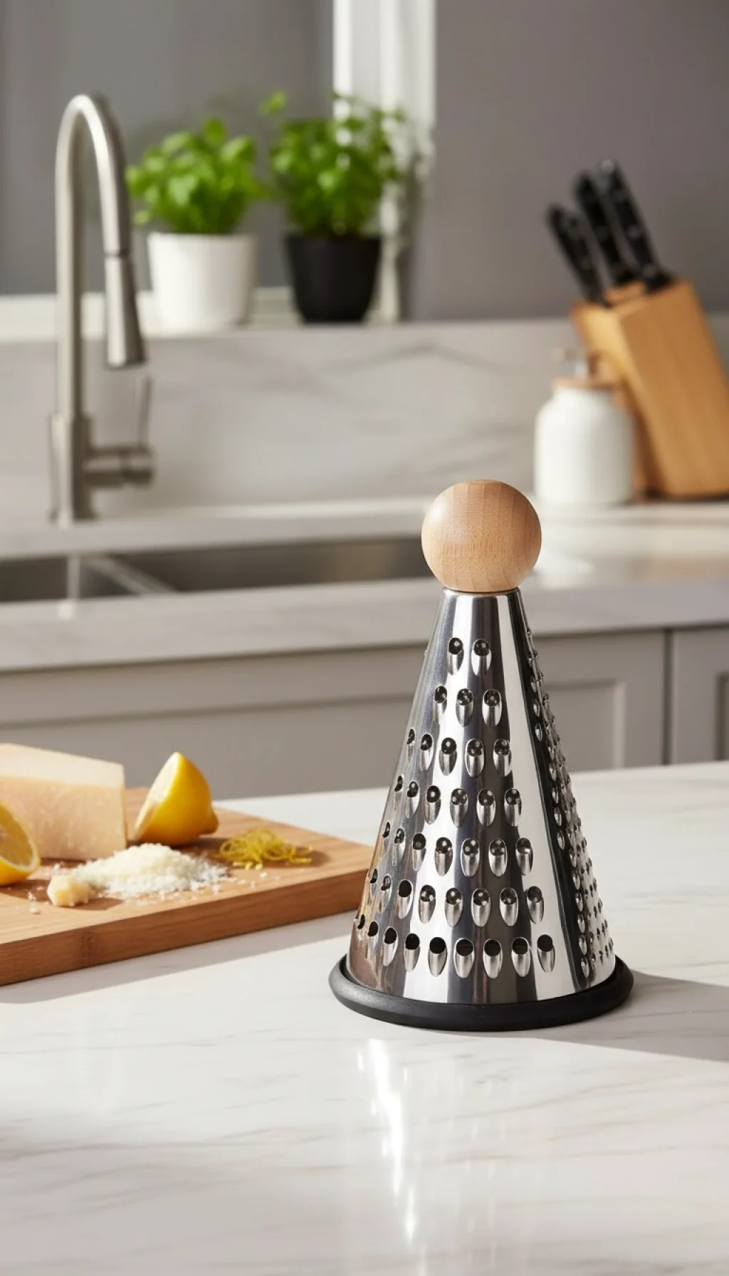 Bu üst düzey konik rende, 11.5 cm taban ve 20 cm boy ölçüleriyle kompakt ama güçlü bir tasarıma sahiptir. Paslanmaz çelik bıçaklar, uzun ömürlü kullanım ve hızlı dilimleme sağlar.
