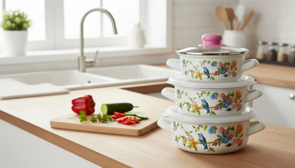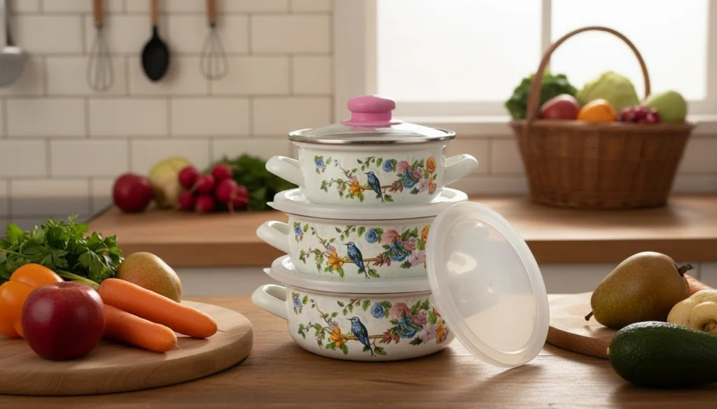 - İçerik: 3 adet emaye tencere (14/16/18 cm),3 adet pişirme kapağı, 3 adet silikon saklama kapağı.
