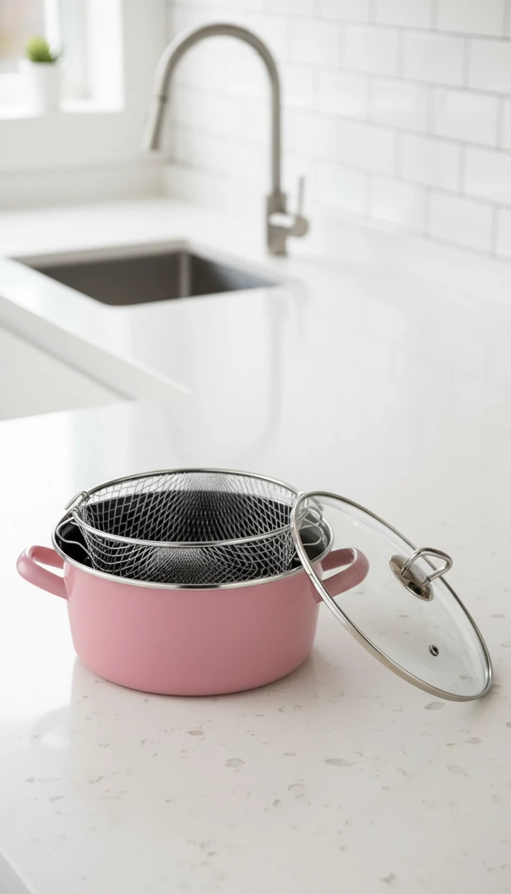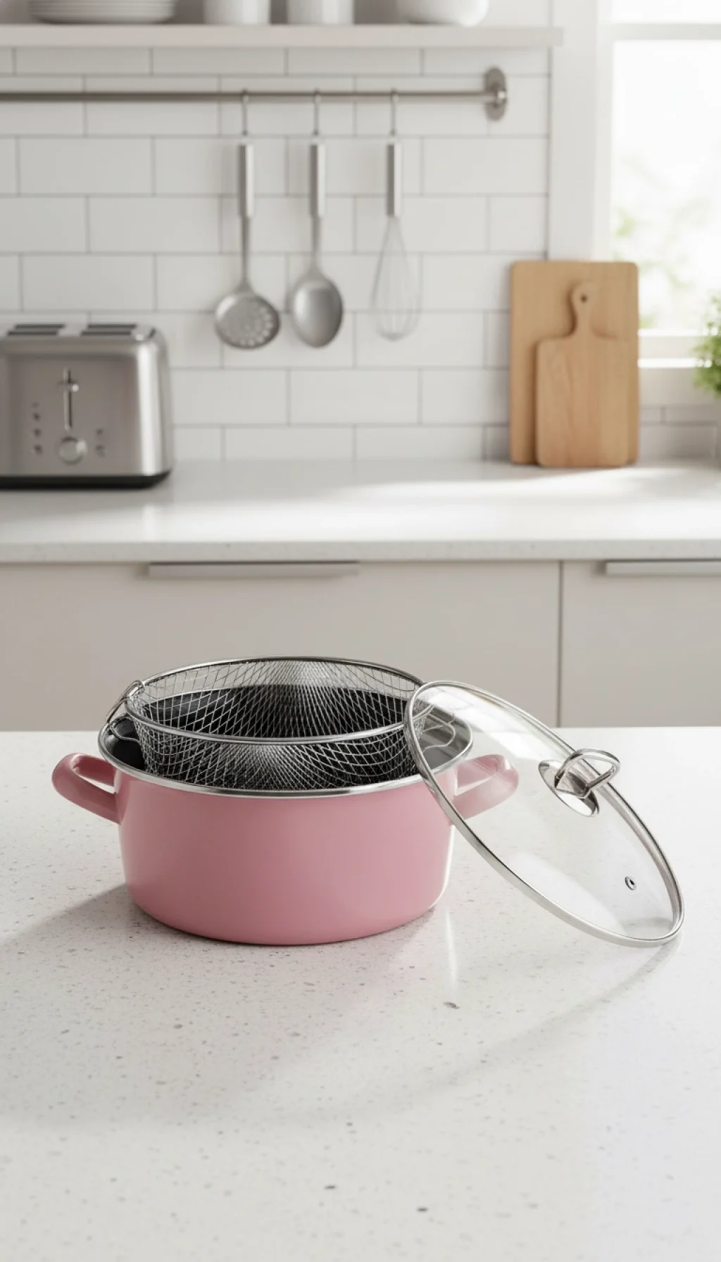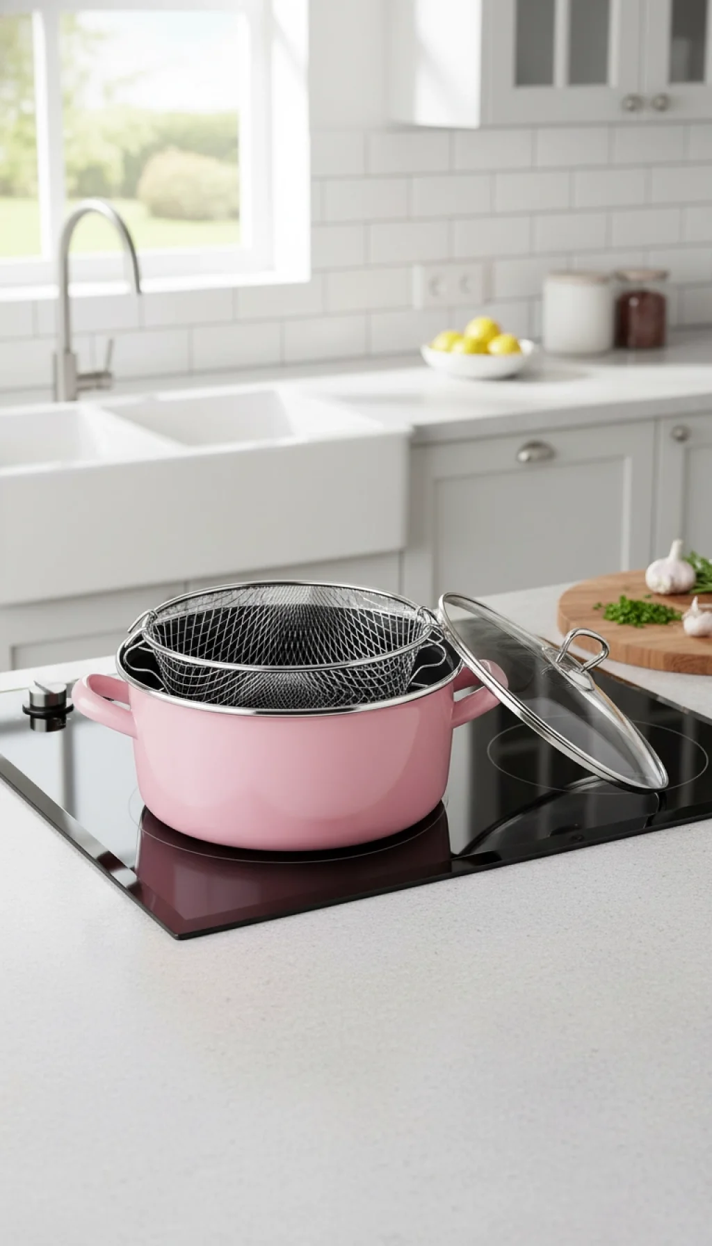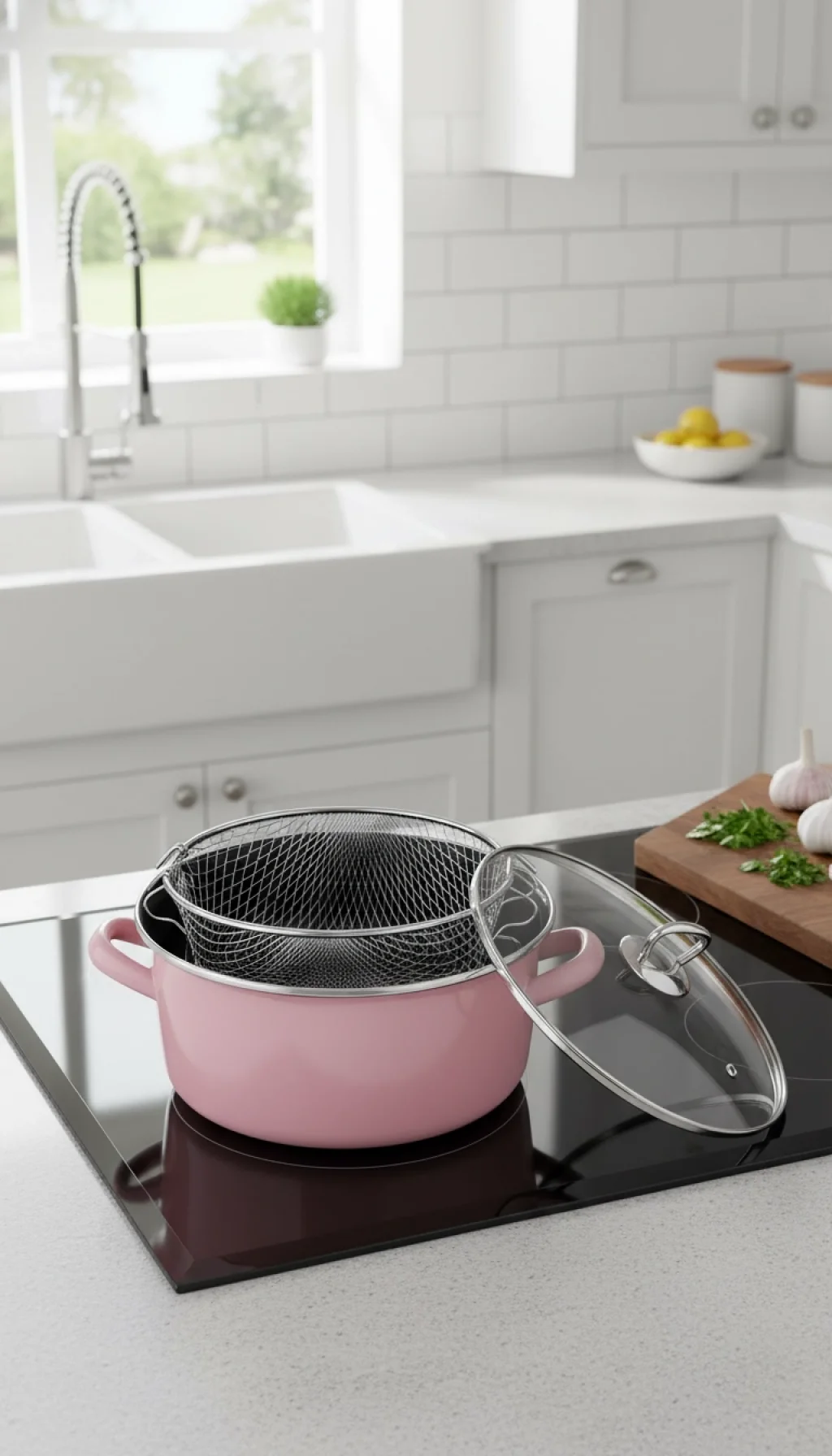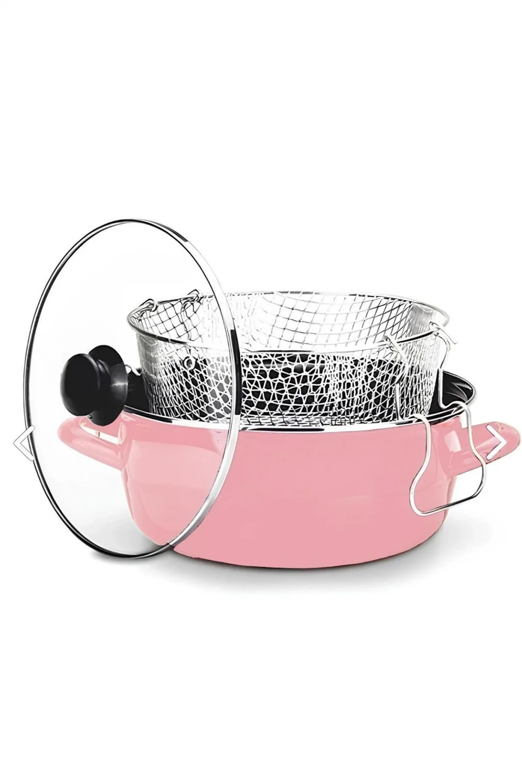 Modern mutfaklar için tasarlanmış, pembe renkli lüks kızartma tenceresi, hem şıklığı hem de işlevselliğiyle öne çıkıyor. 26 cm çapı ve 4,5 litrelik hacmi, aile yemekleri ve özel davetler için ideal bir kapasite sunar.