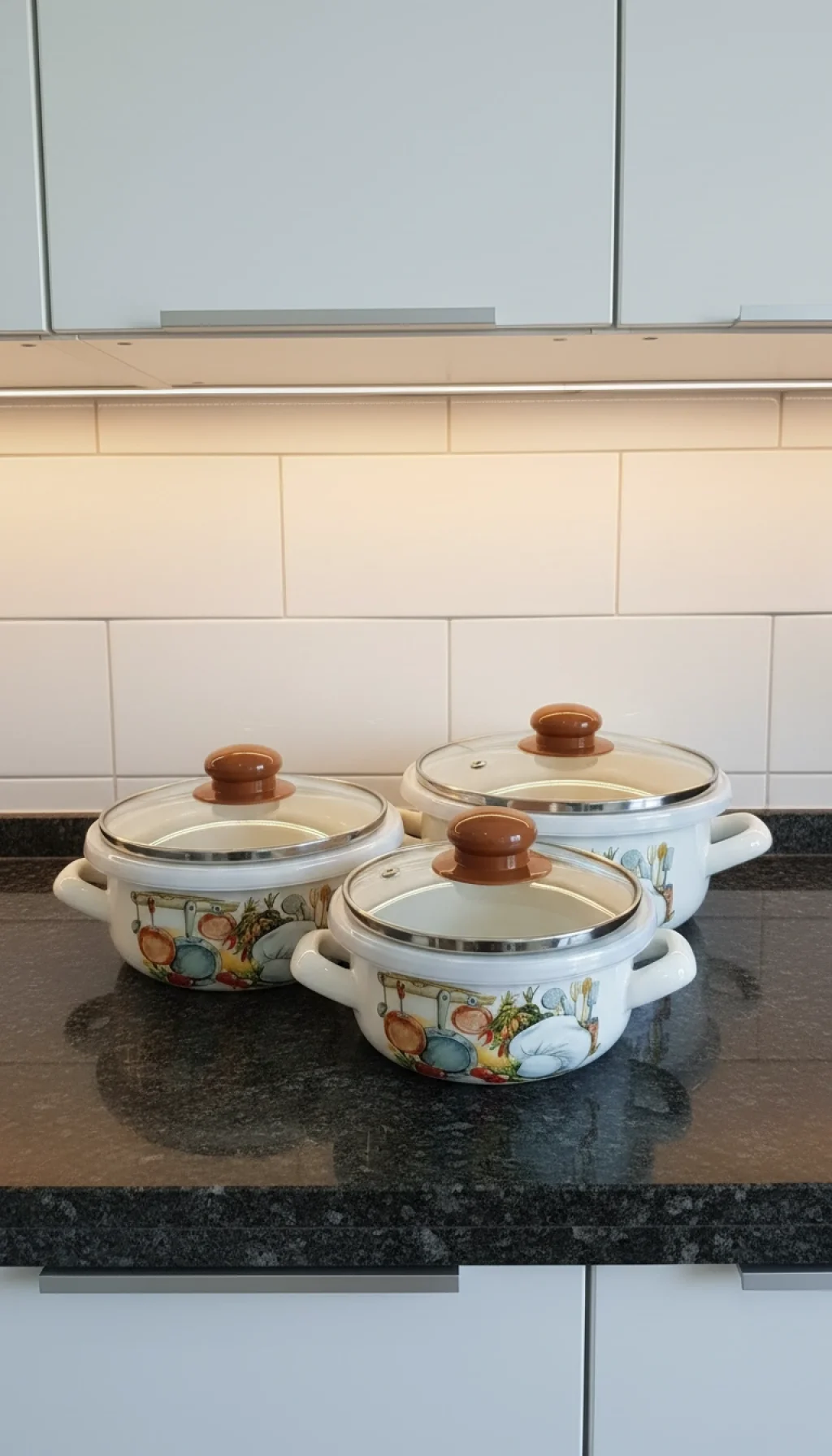 Dekoratif ve Şık: Mutfak ekipmanları figürleriyle süslenmiş bu seri, tezgah üzerinde sergilenecek kadar zarif, fırın ve ocakta kullanılacak kadar dayanıklıdır.