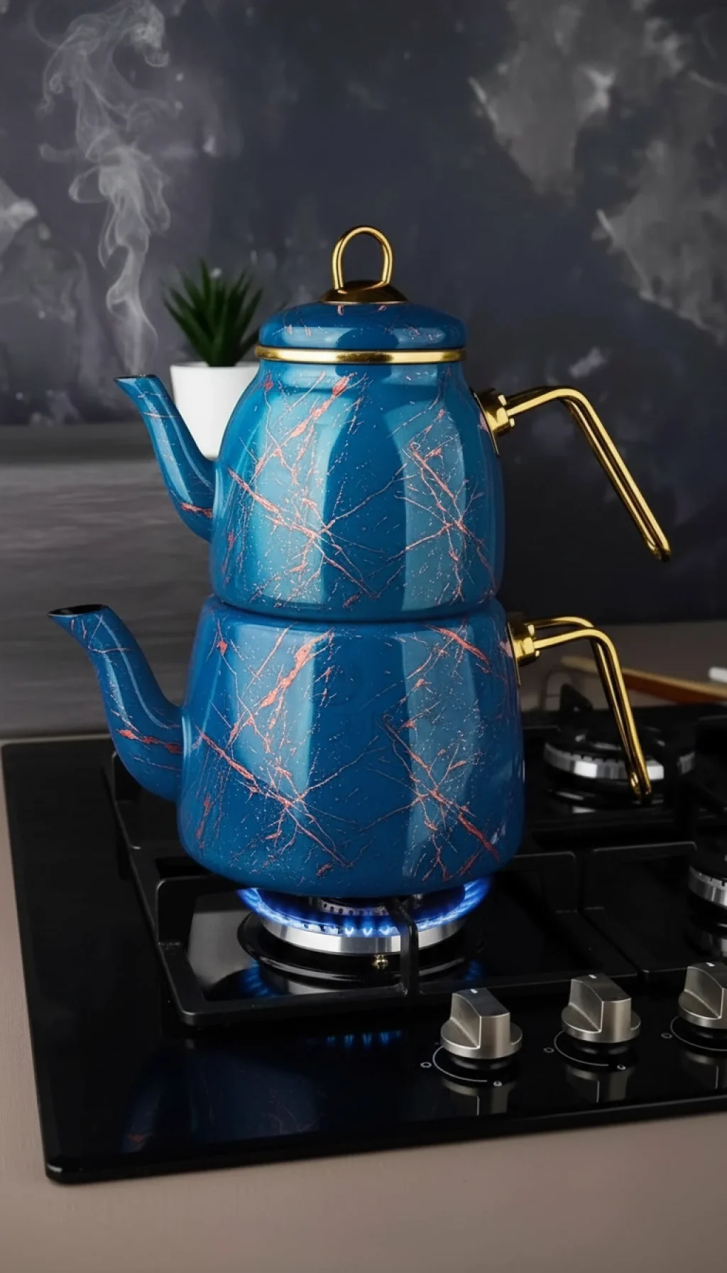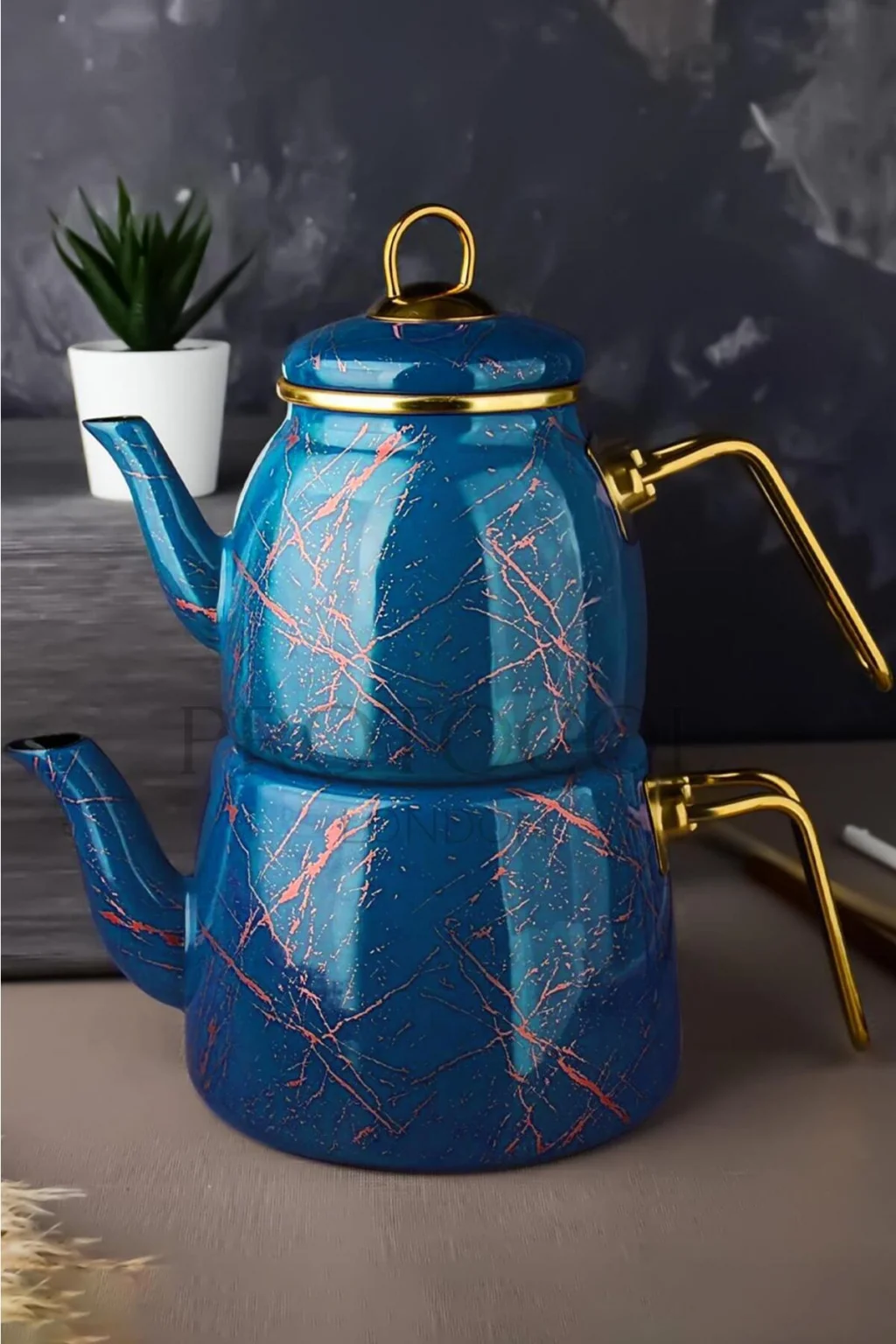 Bu çaydanlık takımı, modern mutfakların vazgeçilmez bir parçası olmayı hedefleyen, emaye kaplama teknolojisiyle üretilmiş, kırık mermer deseniyle sofistike bir görünüme sahip.