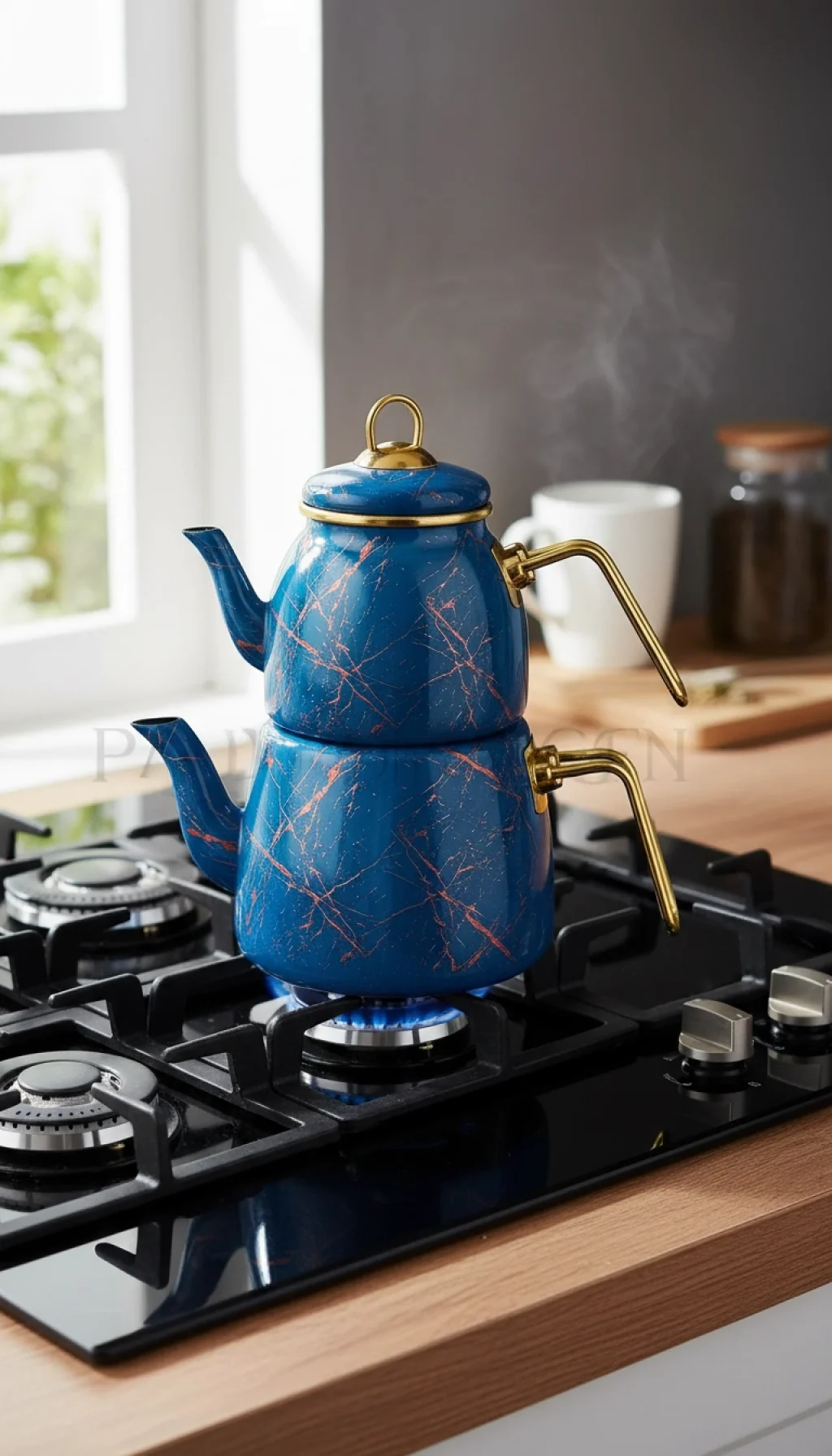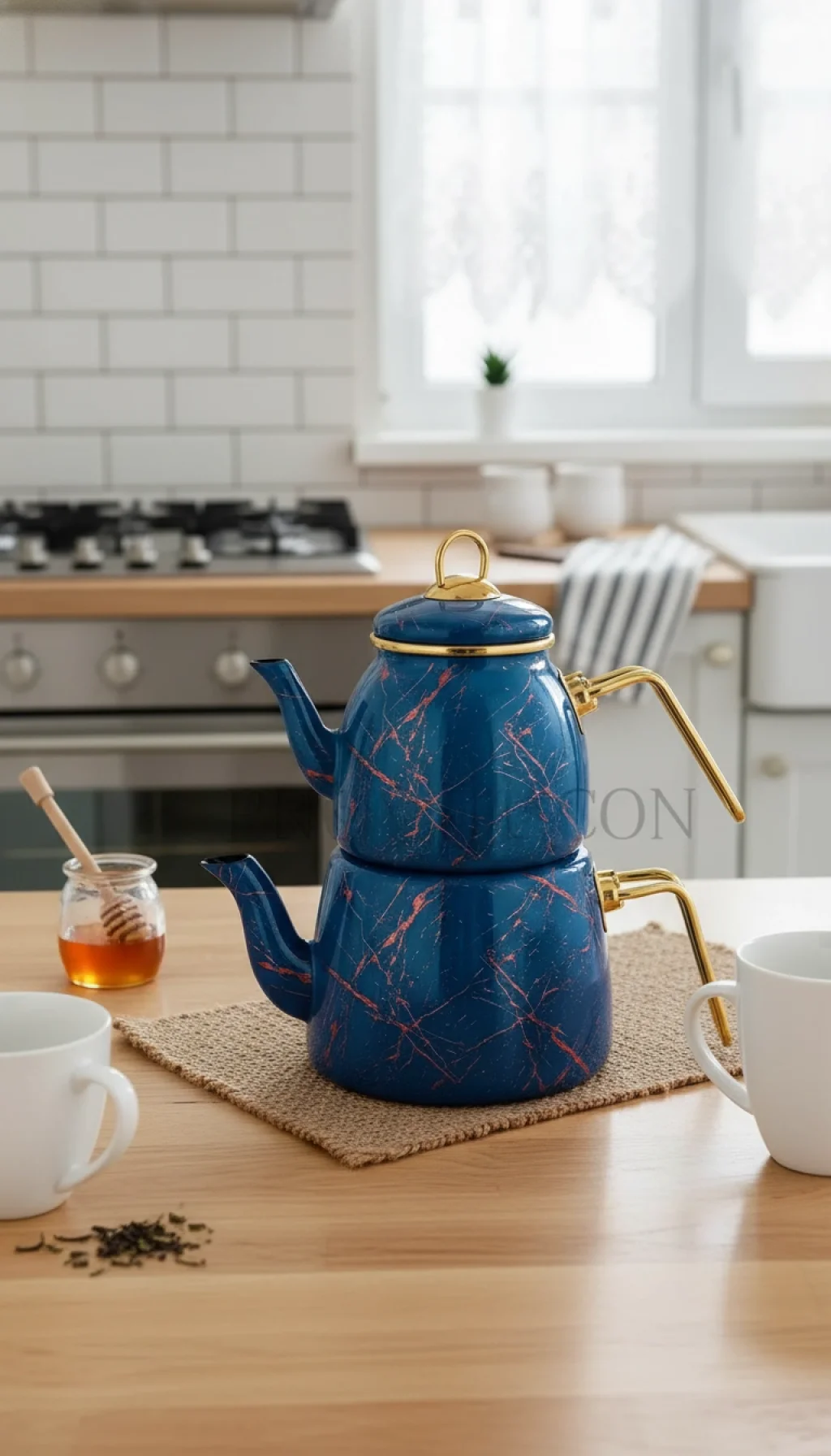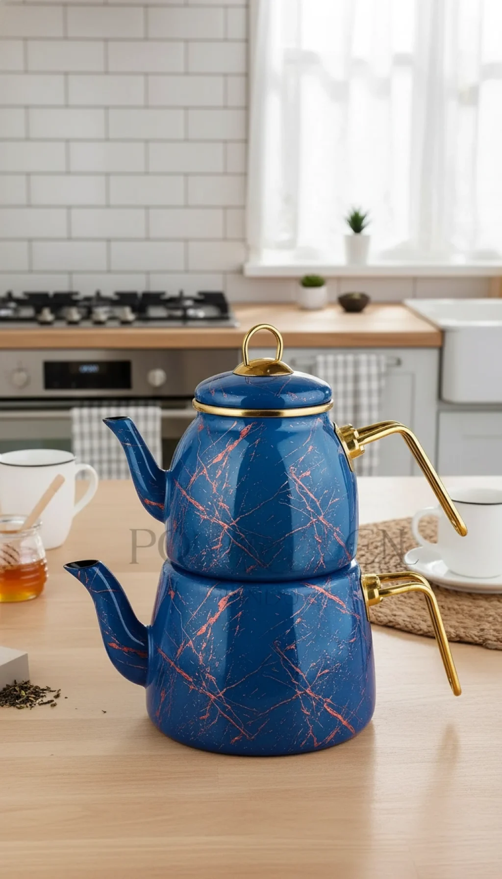 Şıklığı ve fonksiyonelliği bir araya getiren bu çaydanlık takımı, mutfak dekorasyonunuza modern bir hava katmak için mükemmel bir seçenektir.