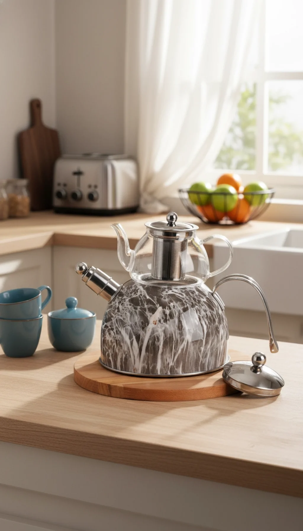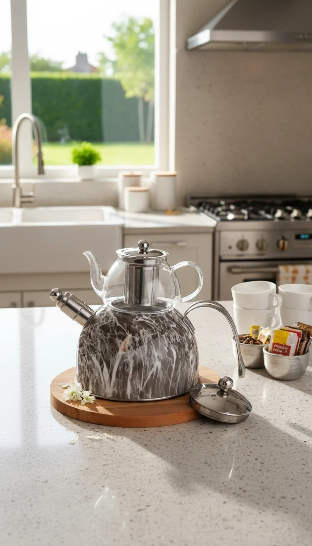 Tasarım: Antrasit Mermer Desenli Gövde & Şeffaf Cam Demlik