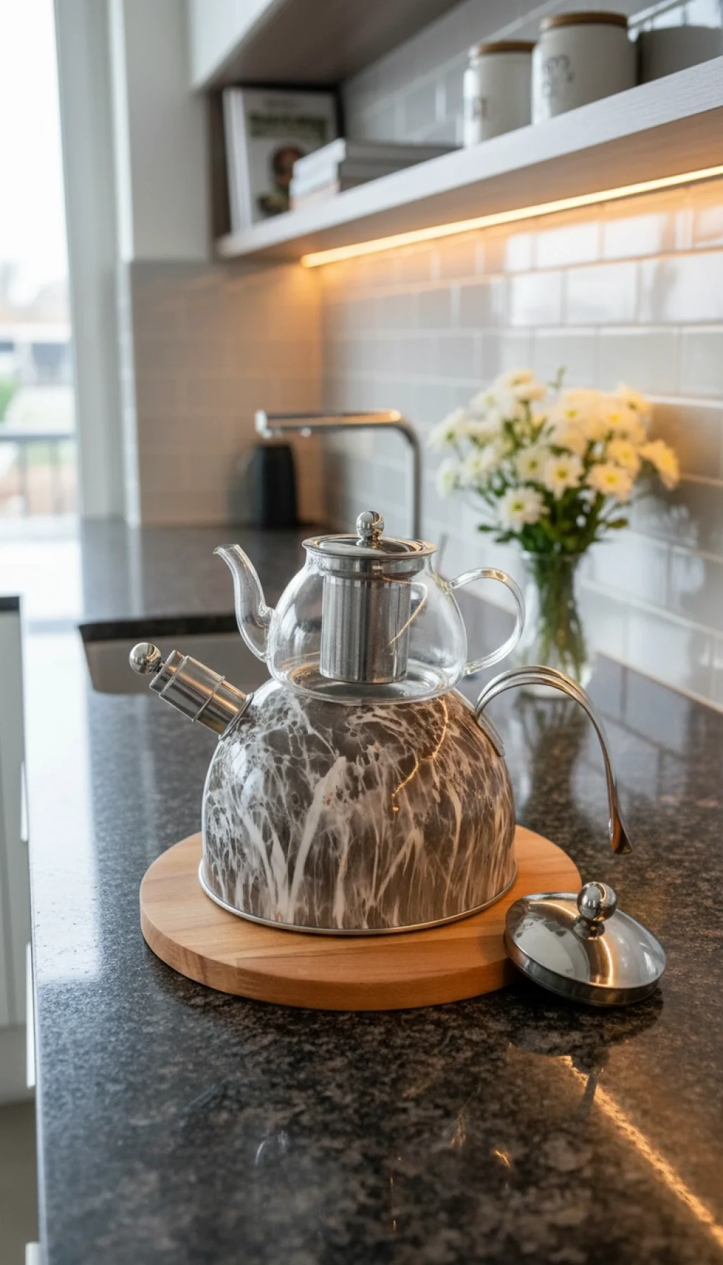 Nishv Pro Mermer Düdüklü Çelik Cam Çaydanlık Takımı – Lüks Açık Gri