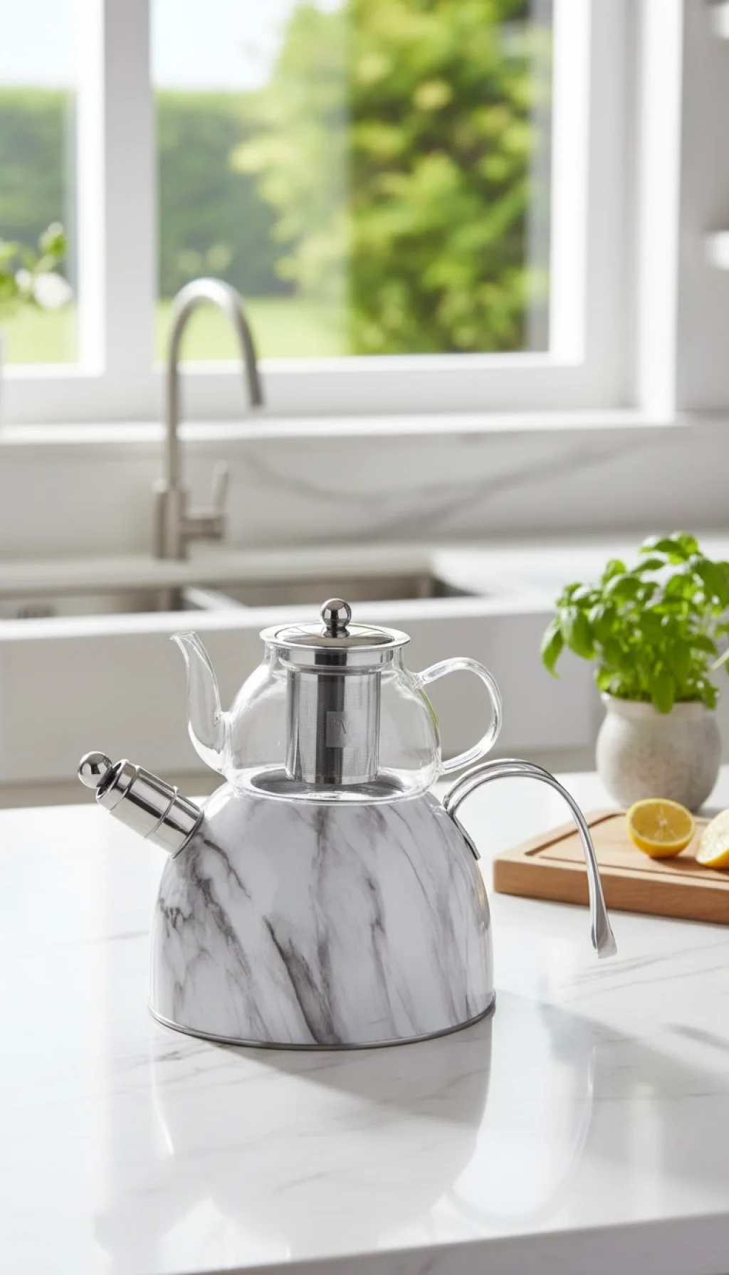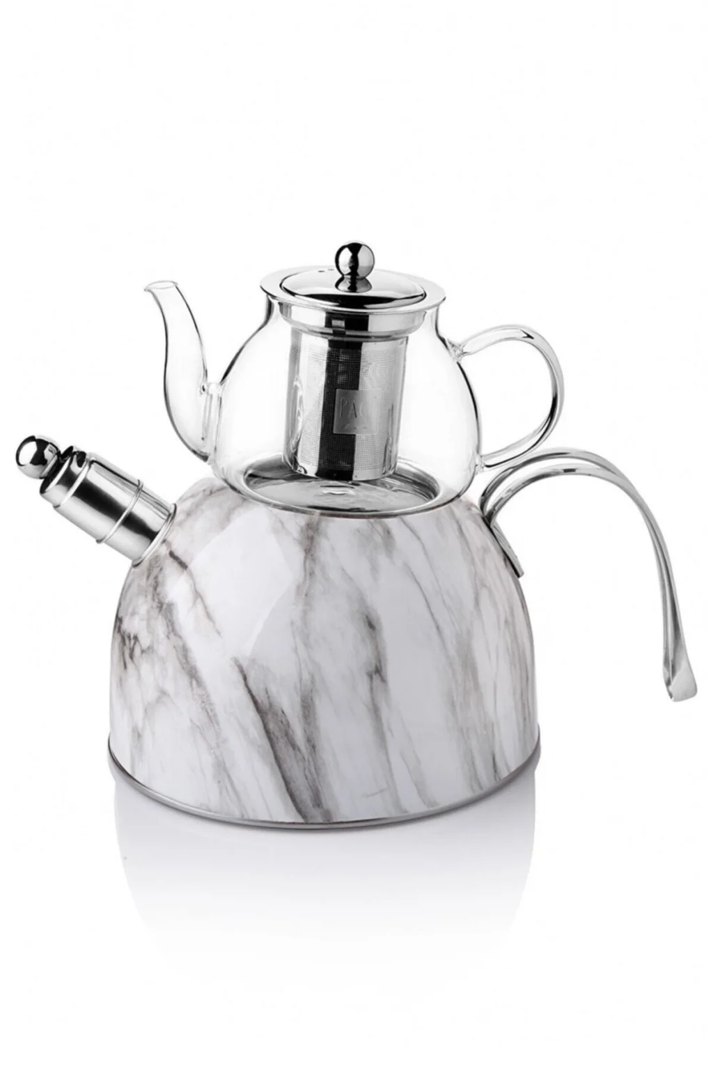 Mermer Düdüklü Çelik Cam Çaydanlık Takımı Beyaz – Premium Şıklık