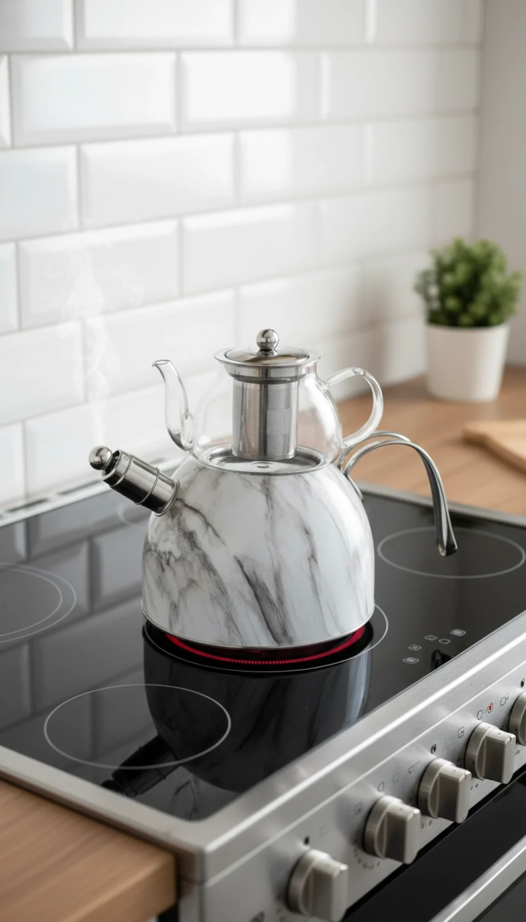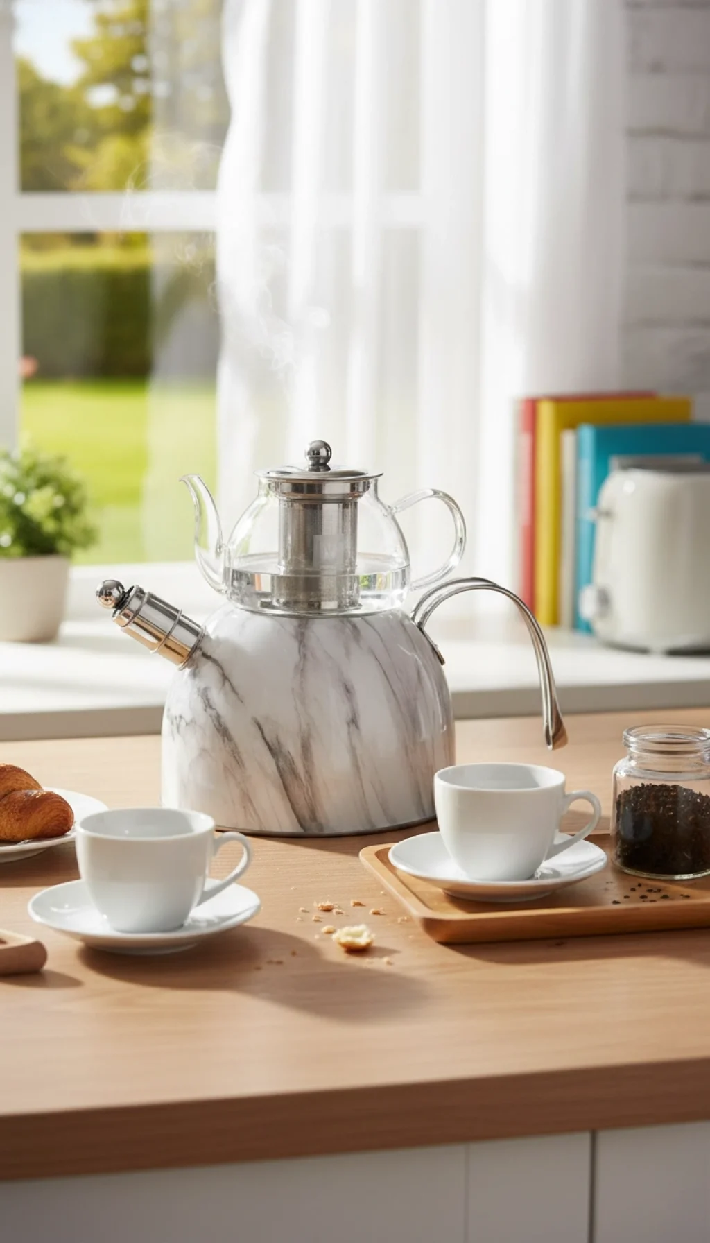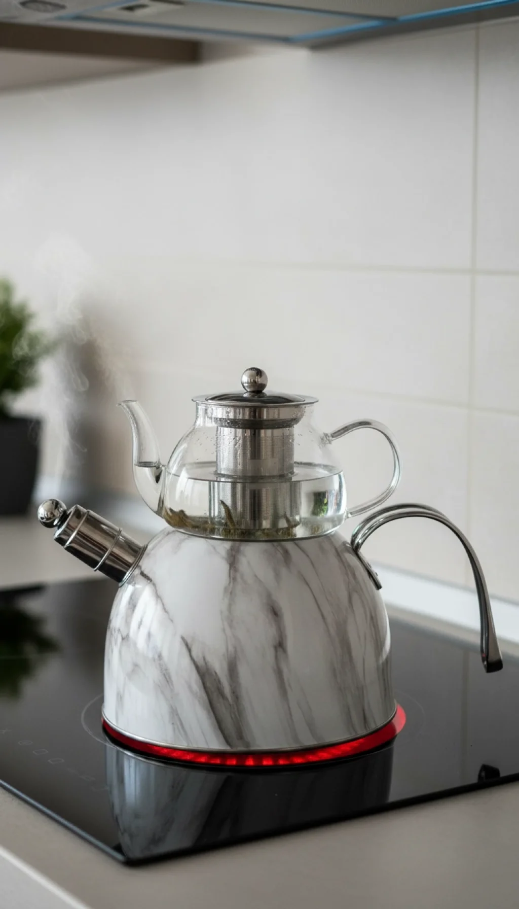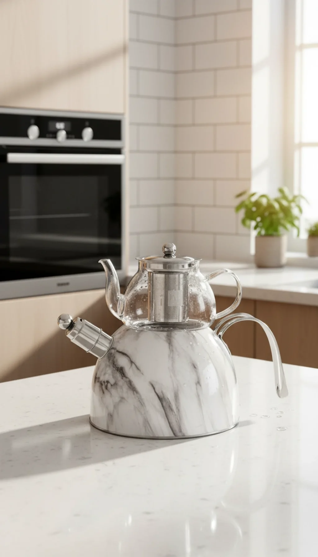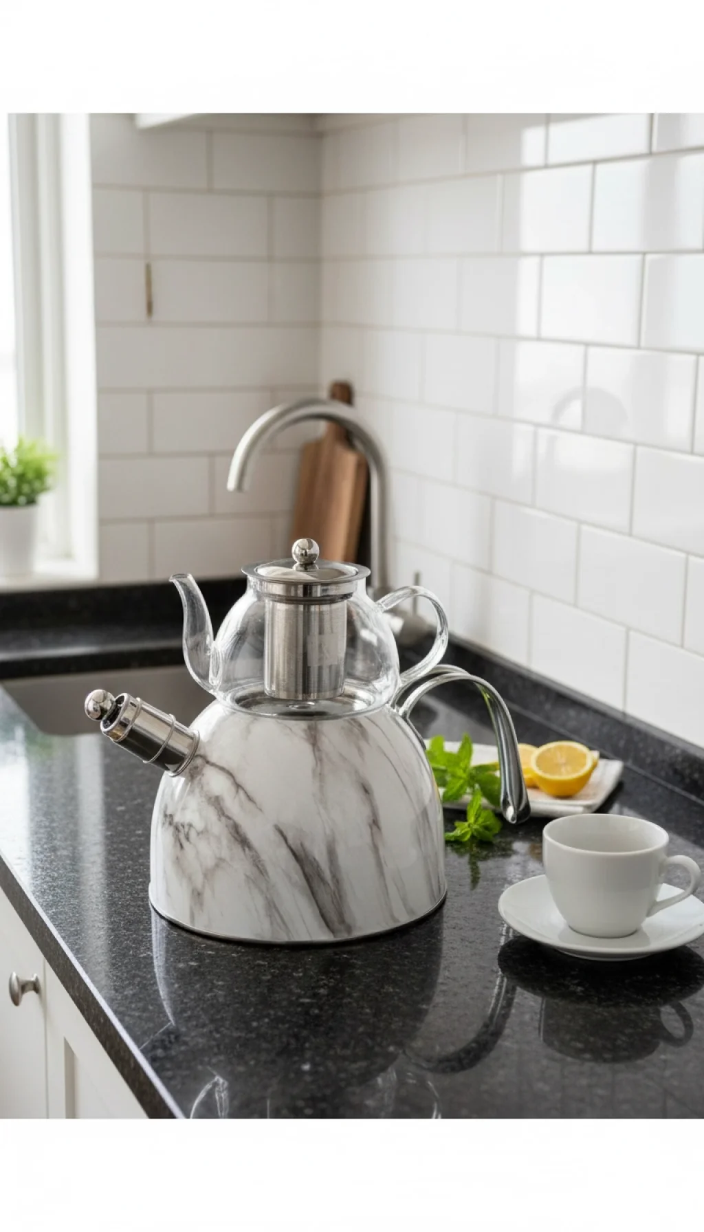 Bu şık çaydanlık takımı, hem estetik hem de fonksiyonelliğiyle evinizin vazgeçilmezi olacak. Mermer dokulu dış kaplaması, çelik ve borosilikat cam birleşimi, uzun ömür ve güvenlik sağlar.