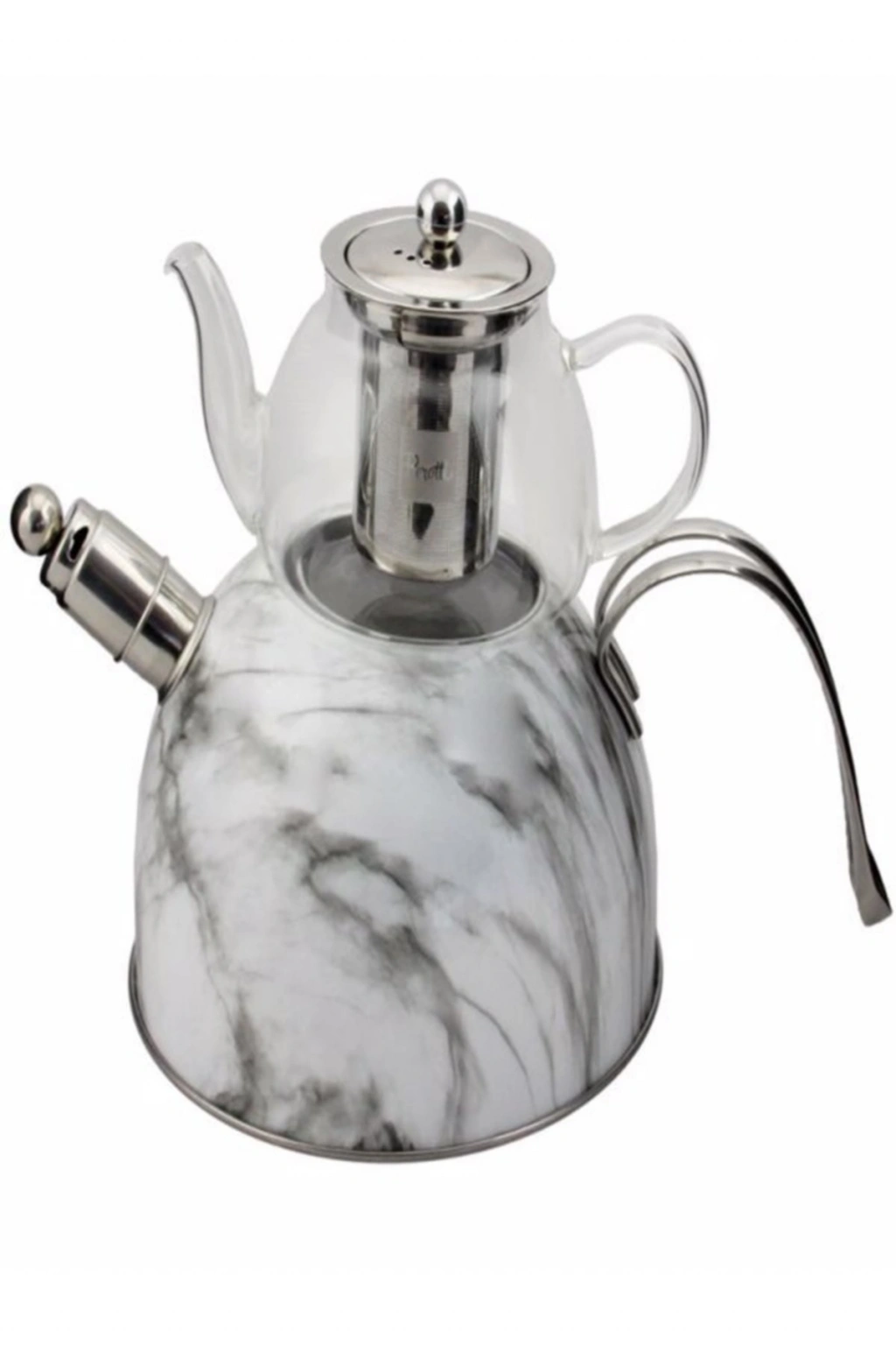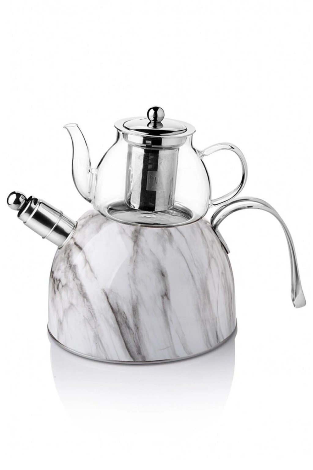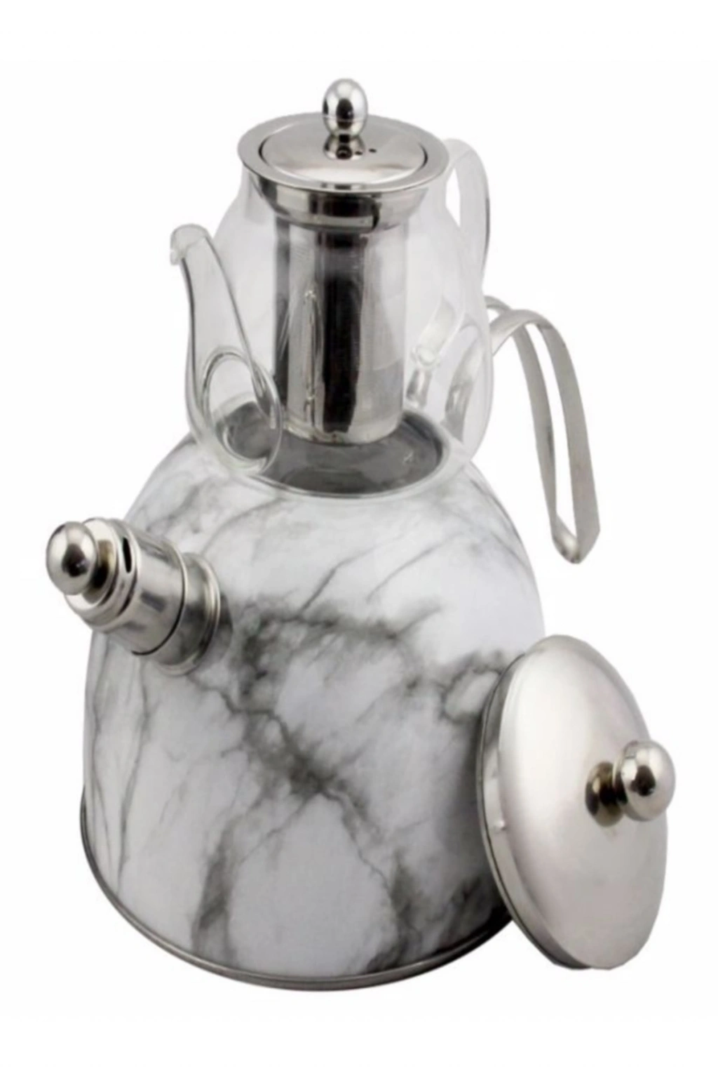 Mermer Düdüklü Çelik Cam Çaydanlık Takımı Beyaz PAÇİ; DÜDÜKLÜ ÇELİK CAM ÇAYDANLIK TAKIMI; Dış Kaplaması Makine de Yıkamaya Uygundur Hacim Değerleri; Üst demlik hacmi: 600 ml; Alt demlik hacmi: 3000 ml Ölçüleri:; Genişlik: 30 cm; Toplam yükseklik: 24,5; Alt demlik yüksekliği: 17 cm; Alt demlik çapı: 20 cm; Üst demlik yüksekliği: 13 cm; Üst demlik çapı: 12 Kutu içeriği; 1 Adet Çelik Alt Demlik; 1 Adet Alt Demlik Kapağı; 1 Adet Borosilikat Cam Üst Demlik; 1 Adet Üst Demlik Kapağı; 1 Adet Çıkartılabilir Düdük Makanizması; 1 Adet Cam Demlik Süzgeci ;;