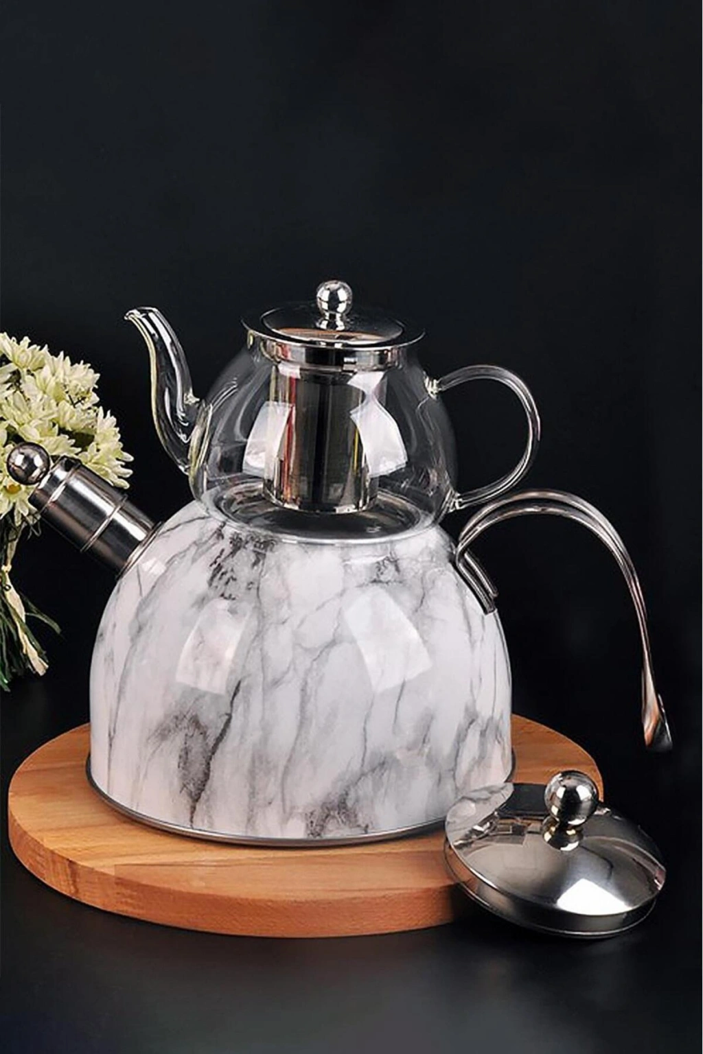 Mermer Düdüklü Çelik Cam Çaydanlık Takımı – Beyaz