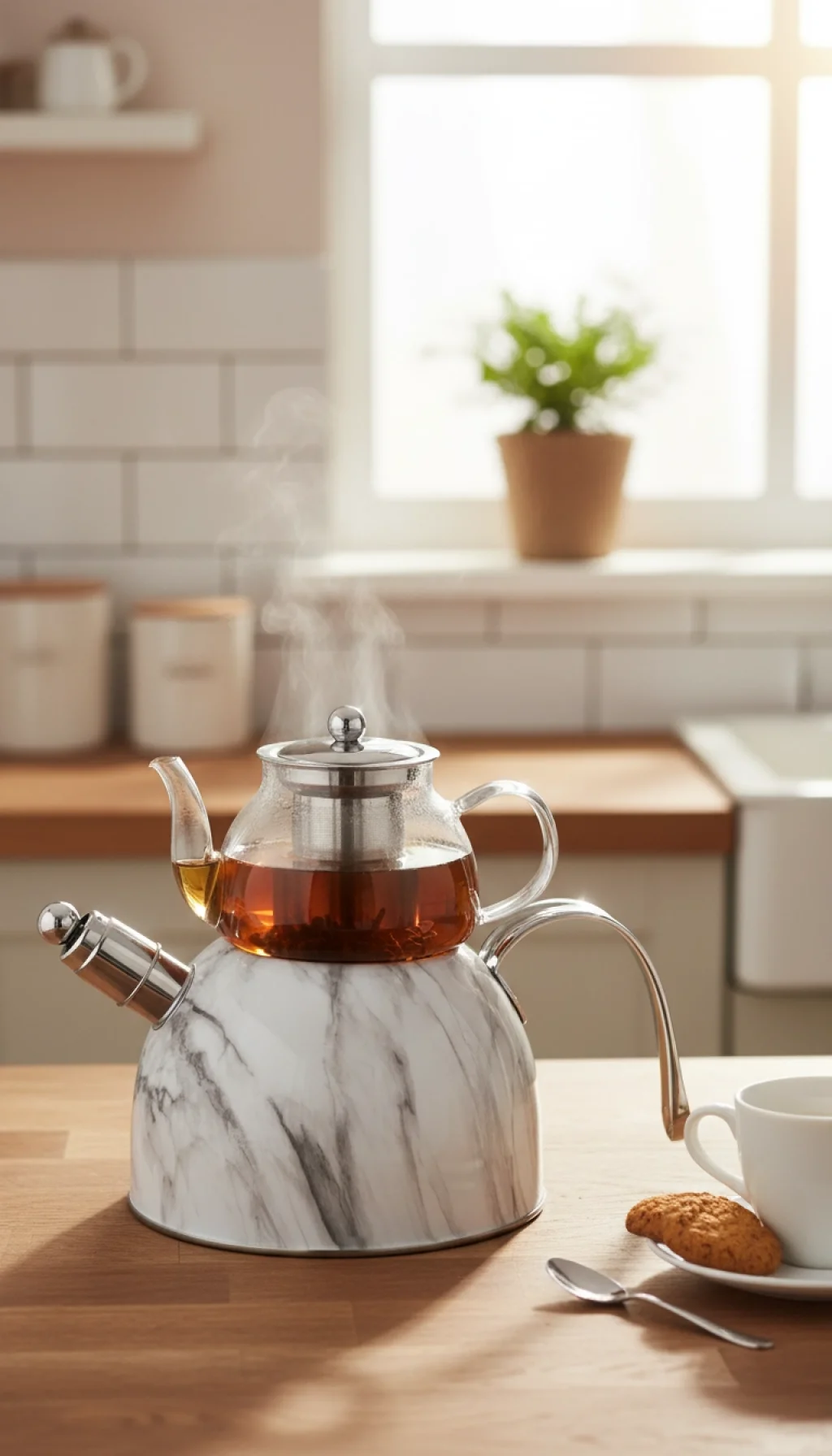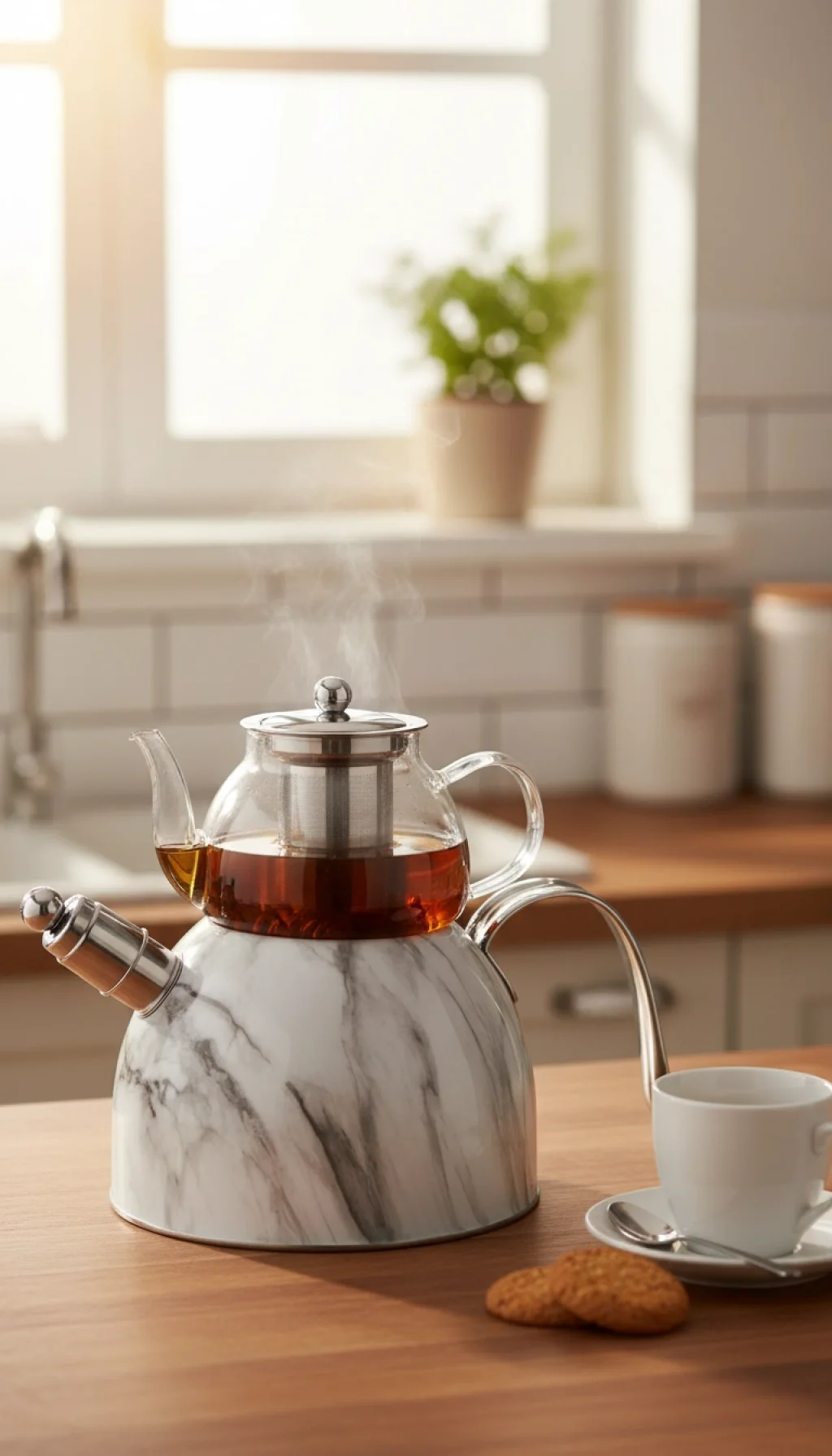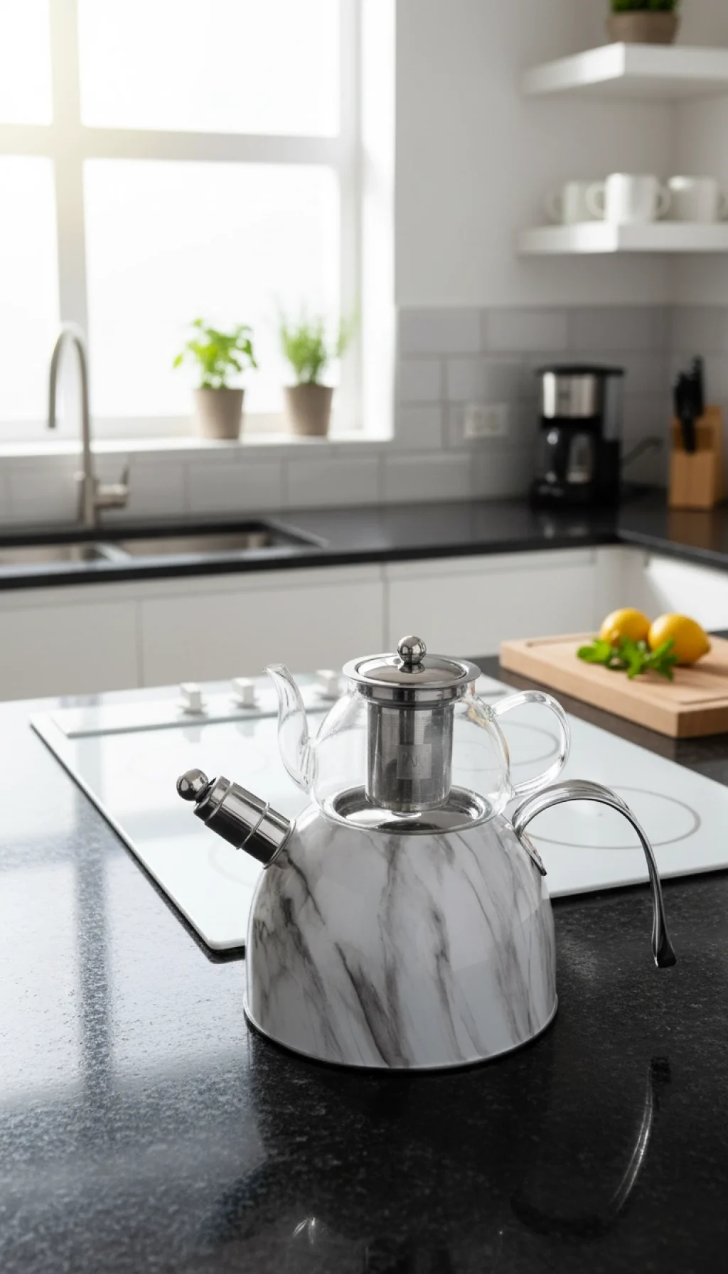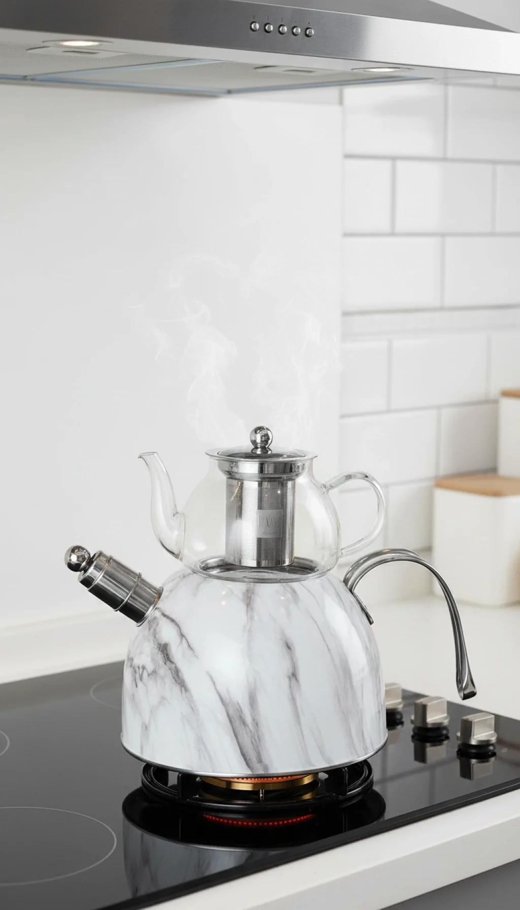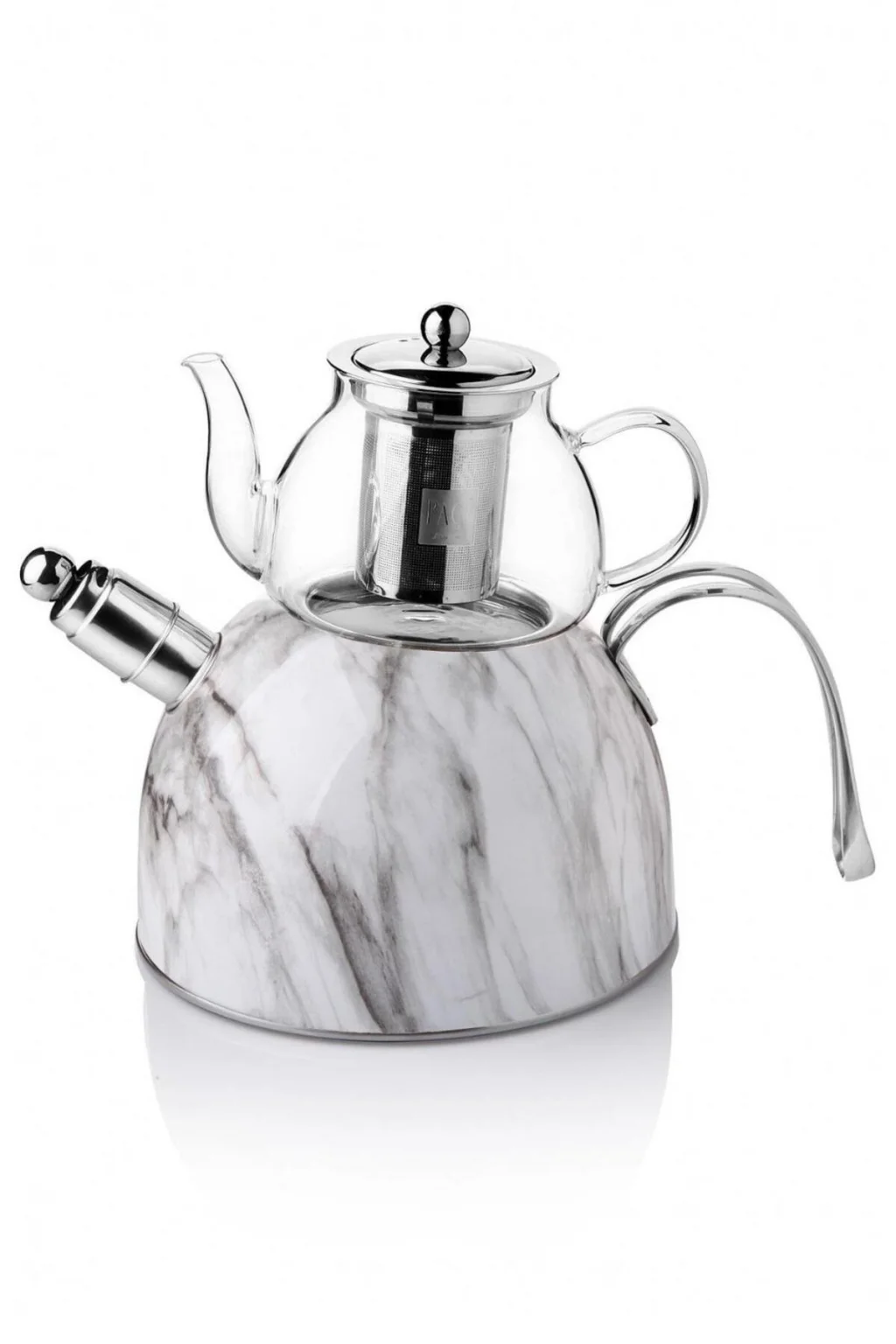 Mermer detaylı tasarımı ve çift katmanlı çelik cam yapısı ile hem şıklığı hem de dayanıklılığı mükemmel bir şekilde birleştiren çaydanlık takımı.