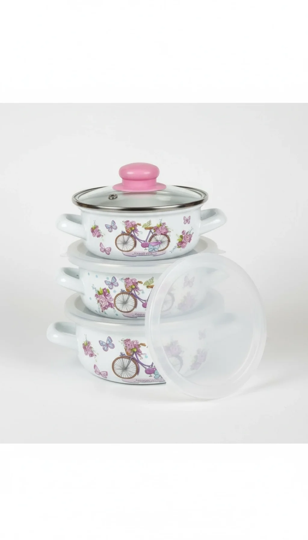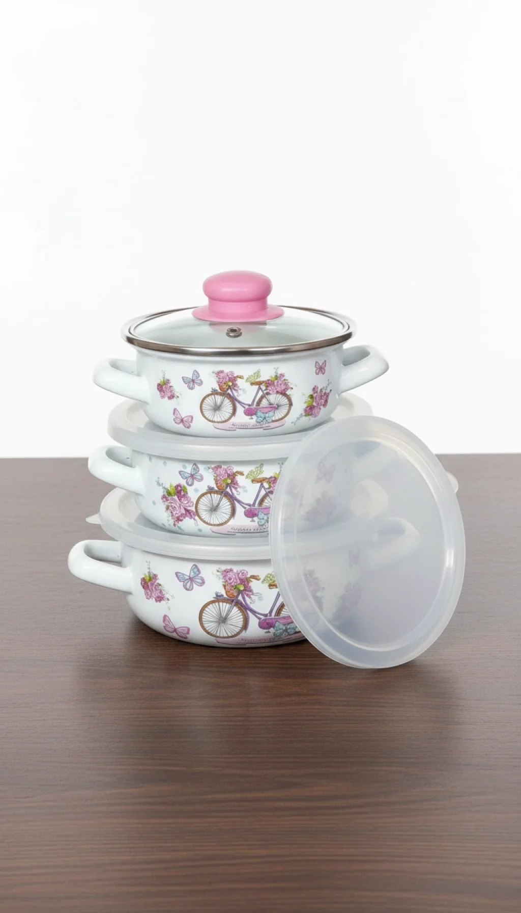 Liva Lüks Emaye Tencere Takımı – Vakumlu Kapaklı Saklama ve Pişirme Seti 14/16/18 Cm