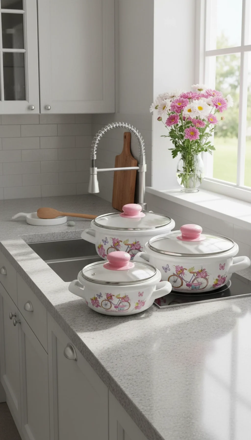 Luca Lüks Emaye Tencere Takımı – Vakumlu Kapaklı Saklama ve Pişirme Seti 14/16/18 Cm