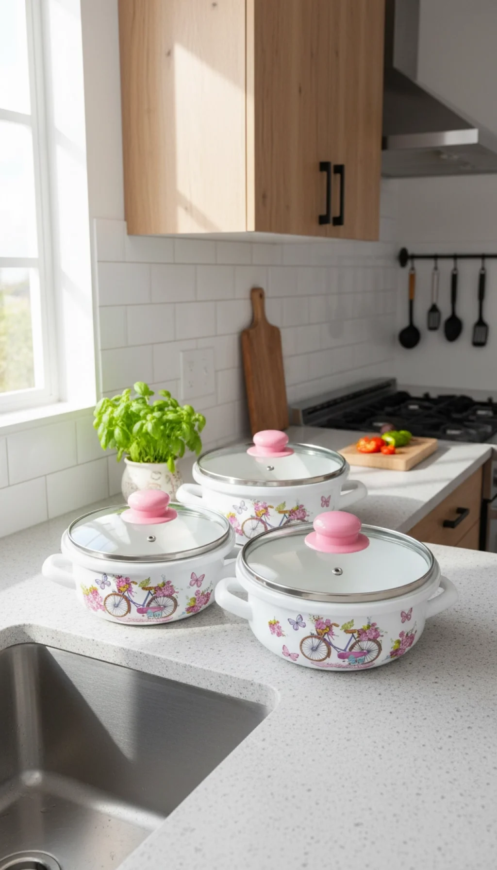 Lüks Mini Emaye Tencere Seti – 12/14/16 cm, 6 Parça Saklama Kabı