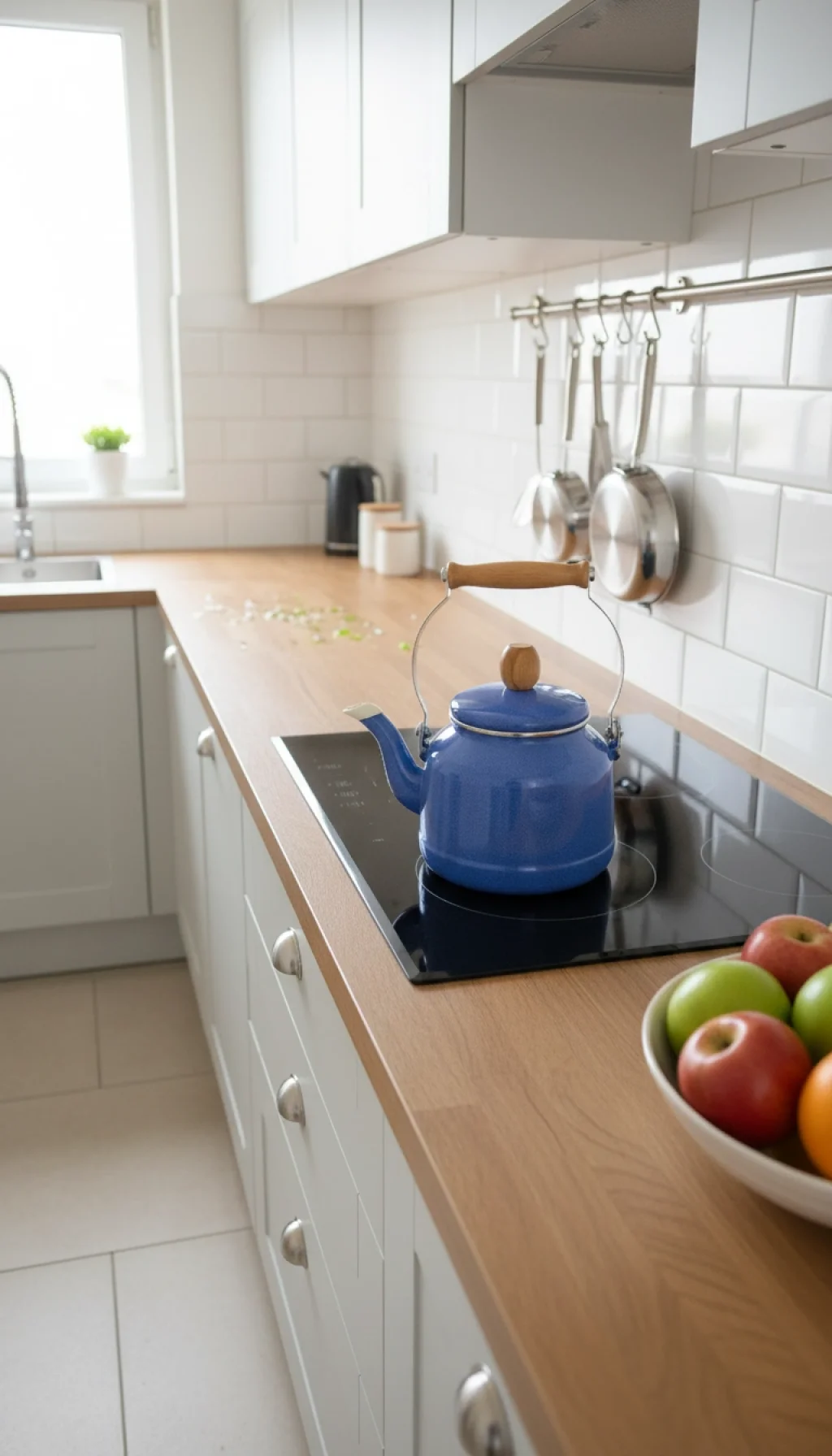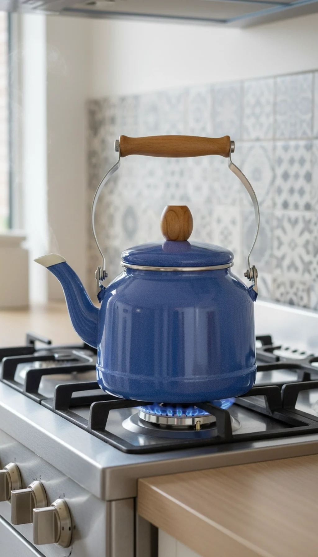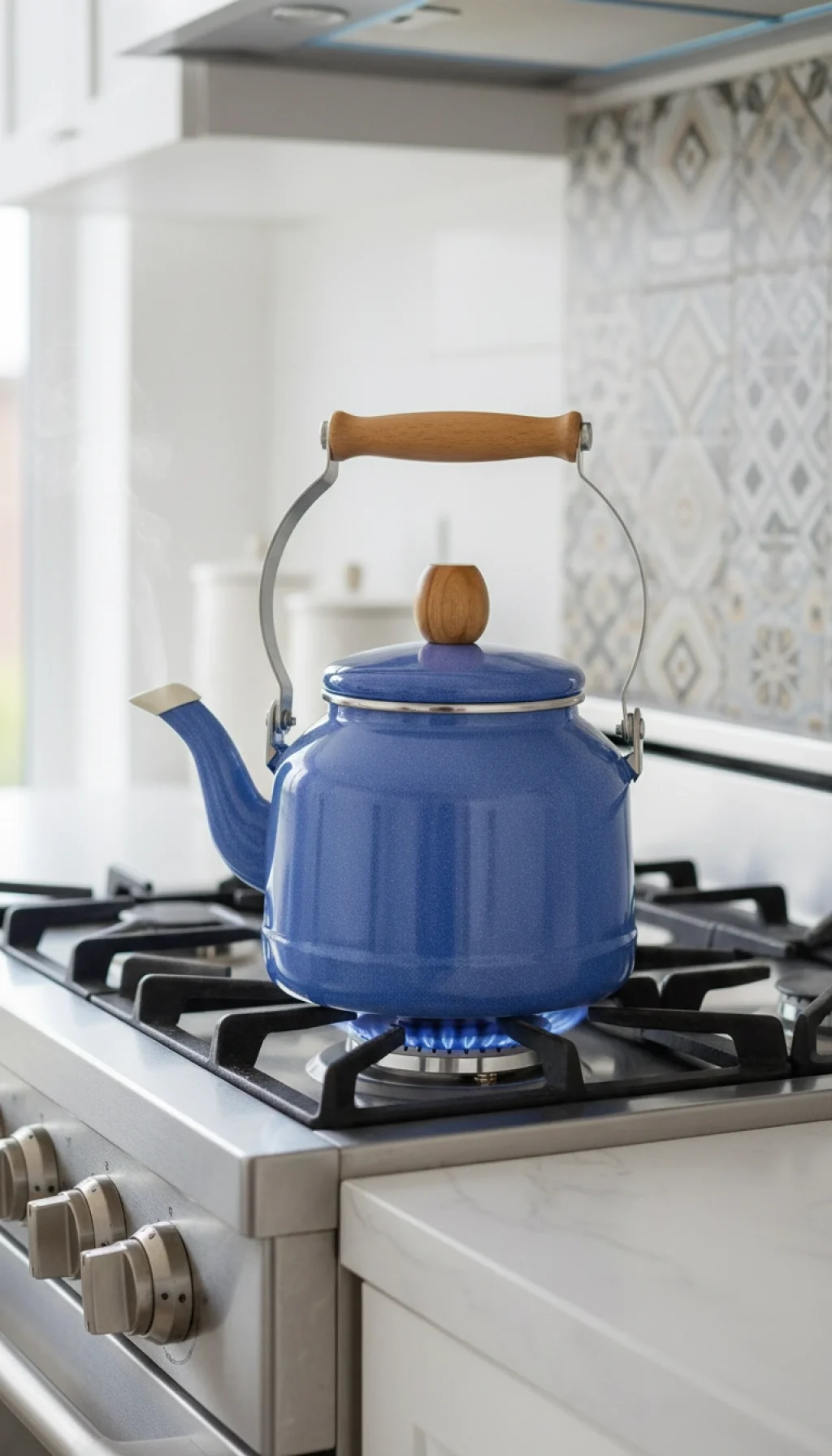 İtalyan zarafetiyle tasarlanmış bu çaydanlık, mavi rengi ve ince ahşap kulplarıyla mutfak dekorasyonunuza estetik bir dokunuş katar.