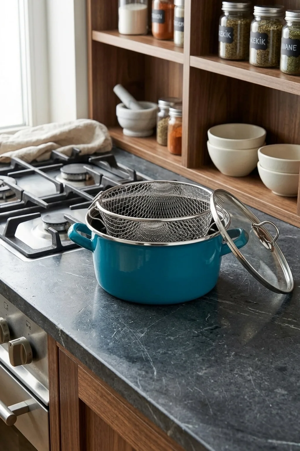 Turkuaz renkli lüks fritöz tenceresi, 22 cm çapı ve 3,5 litre kapasitesiyle hem geniş porsiyonlar için ideal, hem de aile yemeklerinde mükemmel bir partnerdir.