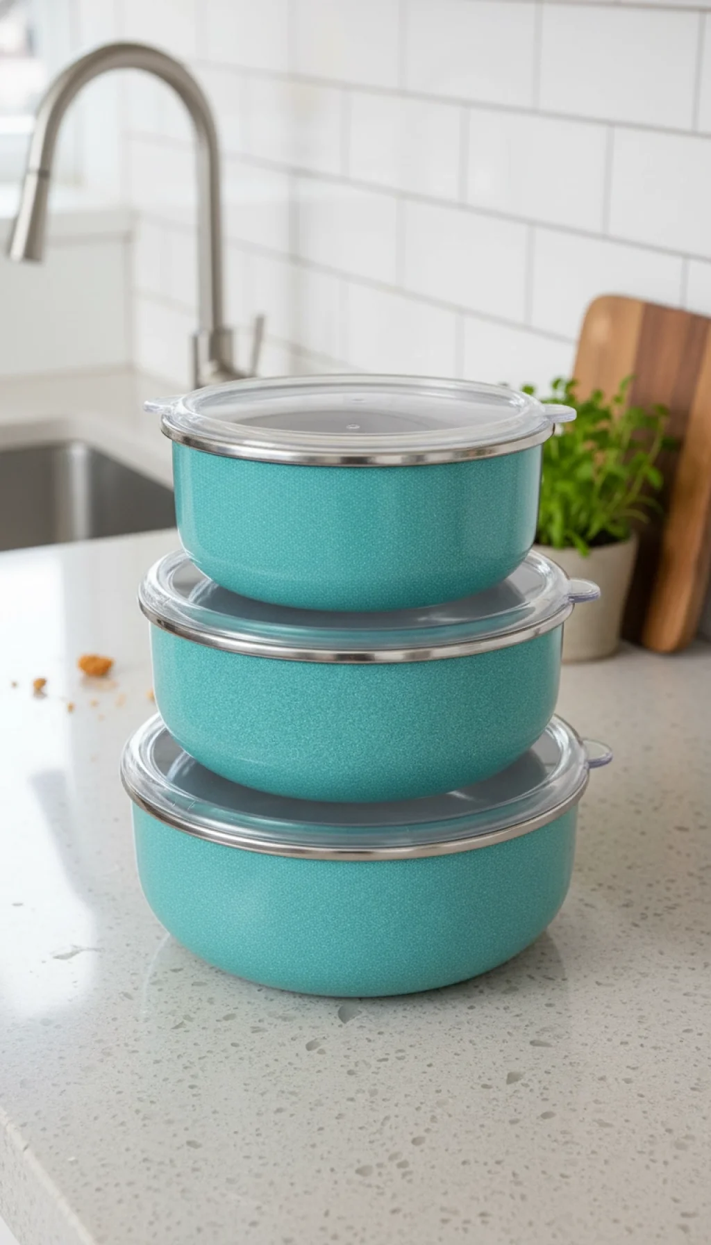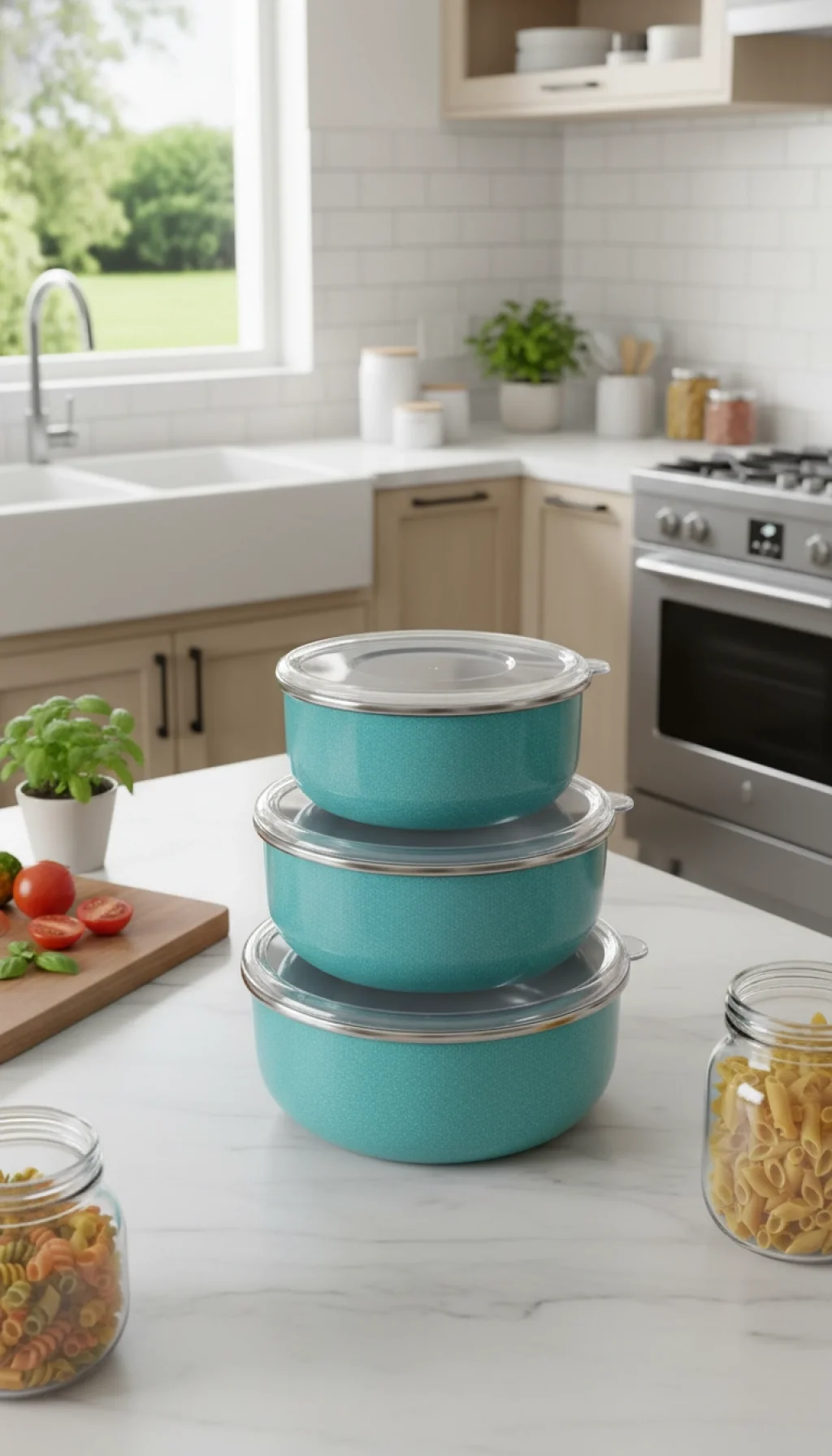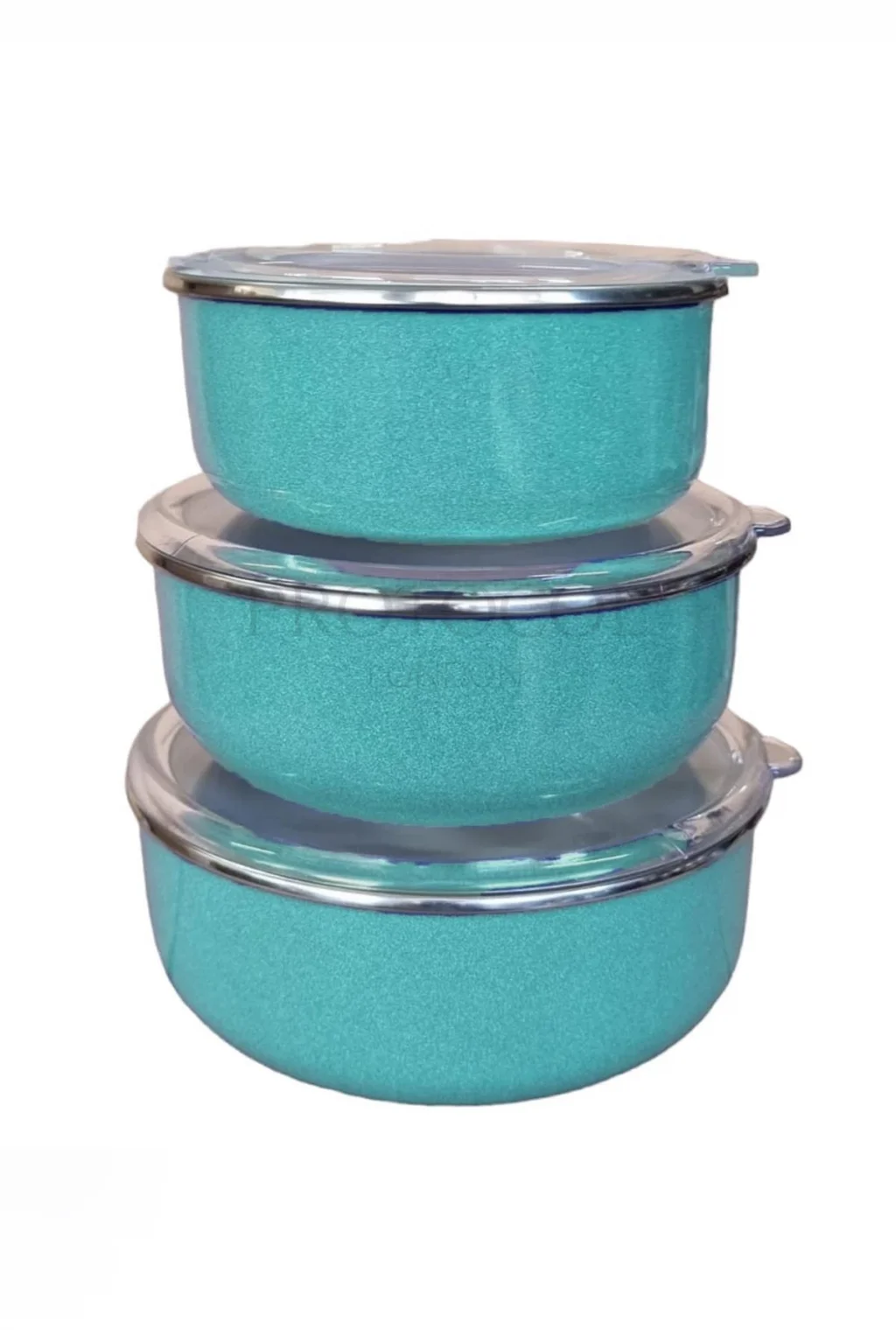 İtalya’nın zarif emaye tasarımıyla hazırlanan 3’lü saklama kabı seti, 14, 16 ve 18 cm ölçülerinde farklı boyutlarda sunularak mutfak düzeninizi kolaylaştırır.