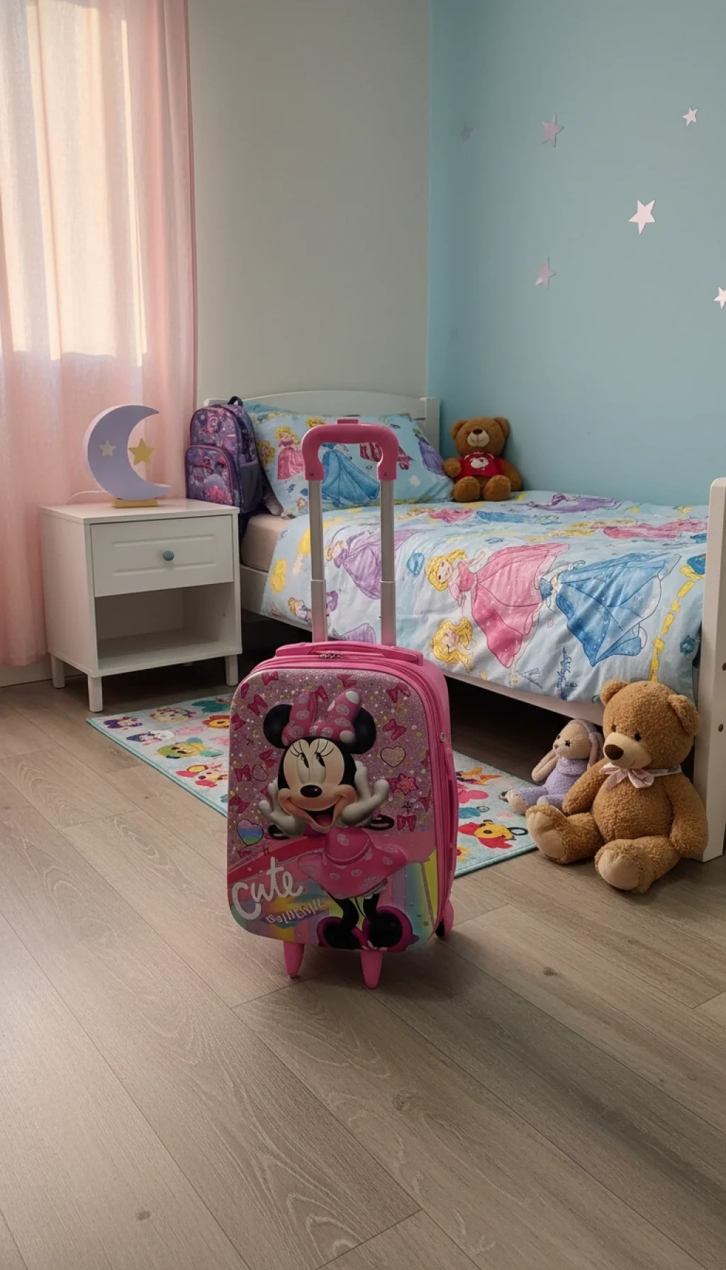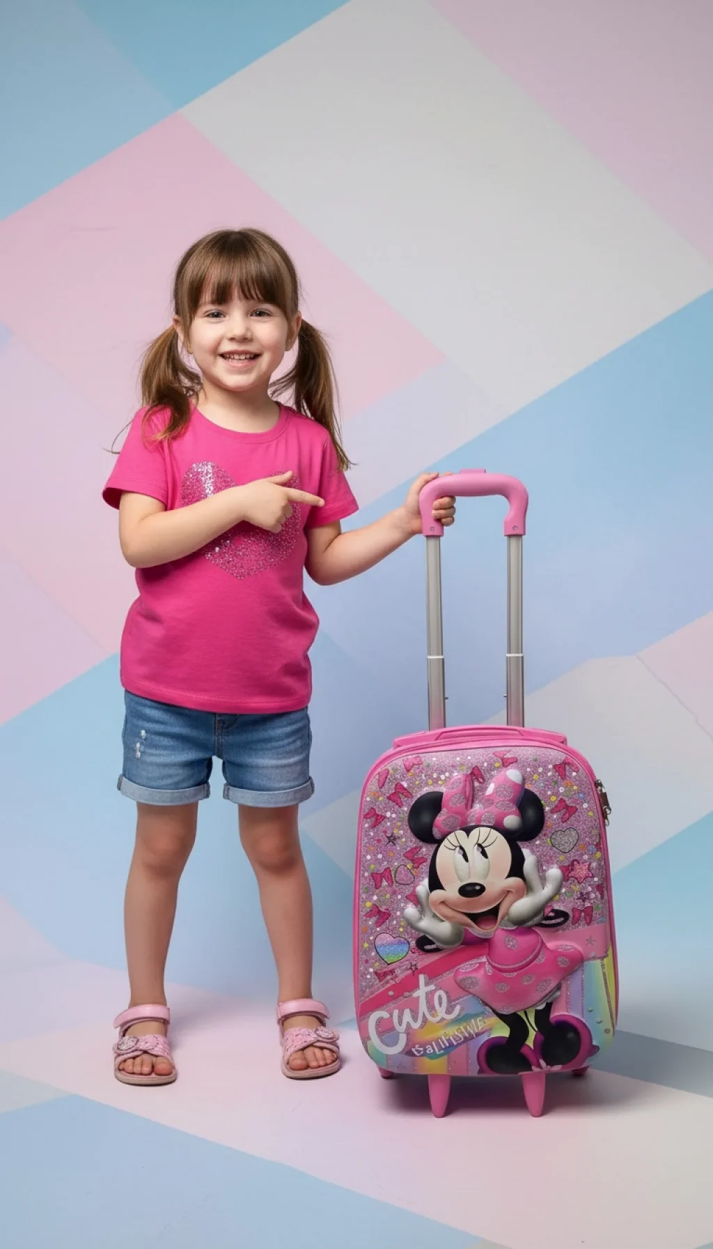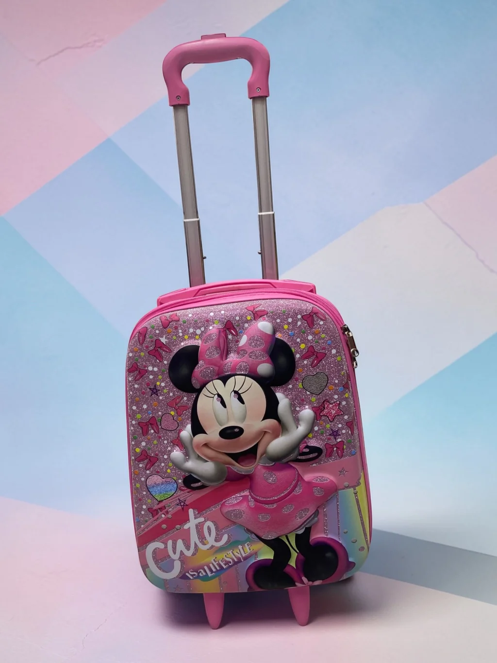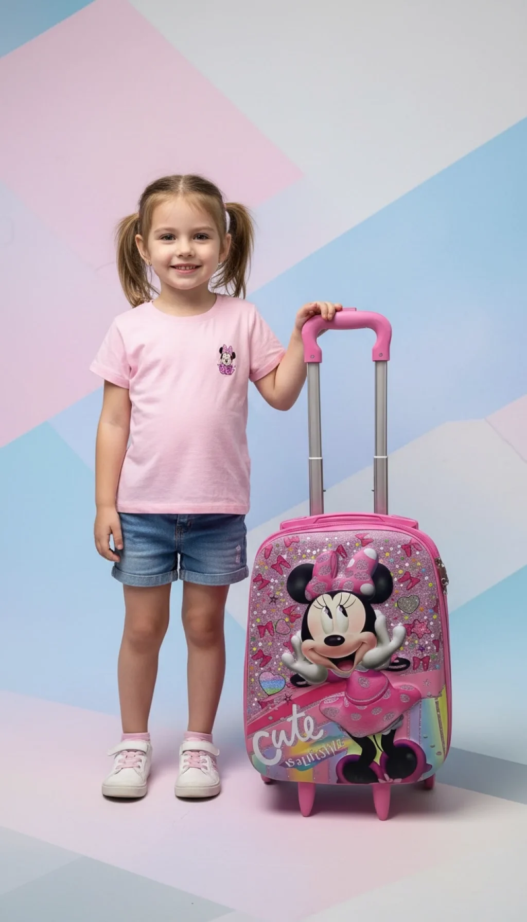 Modayı ve eğlenceyi seven minik gezginler buraya! Nishev koleksiyonunun en neşeli parçalarından biri olan bu Minnie karakterli pembe çocuk valizi, ikonik fiyonkları ve puantiyeli elbisesiyle seyahatlere sevgi katıyor. Gökkuşağı detayları ve ışıltılı yüzeyiyle bu valiz, küçük hanımların vazgeçilmez seyahat aksesuarı olacak.