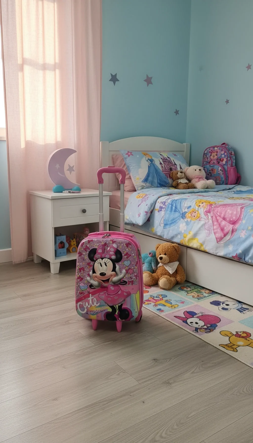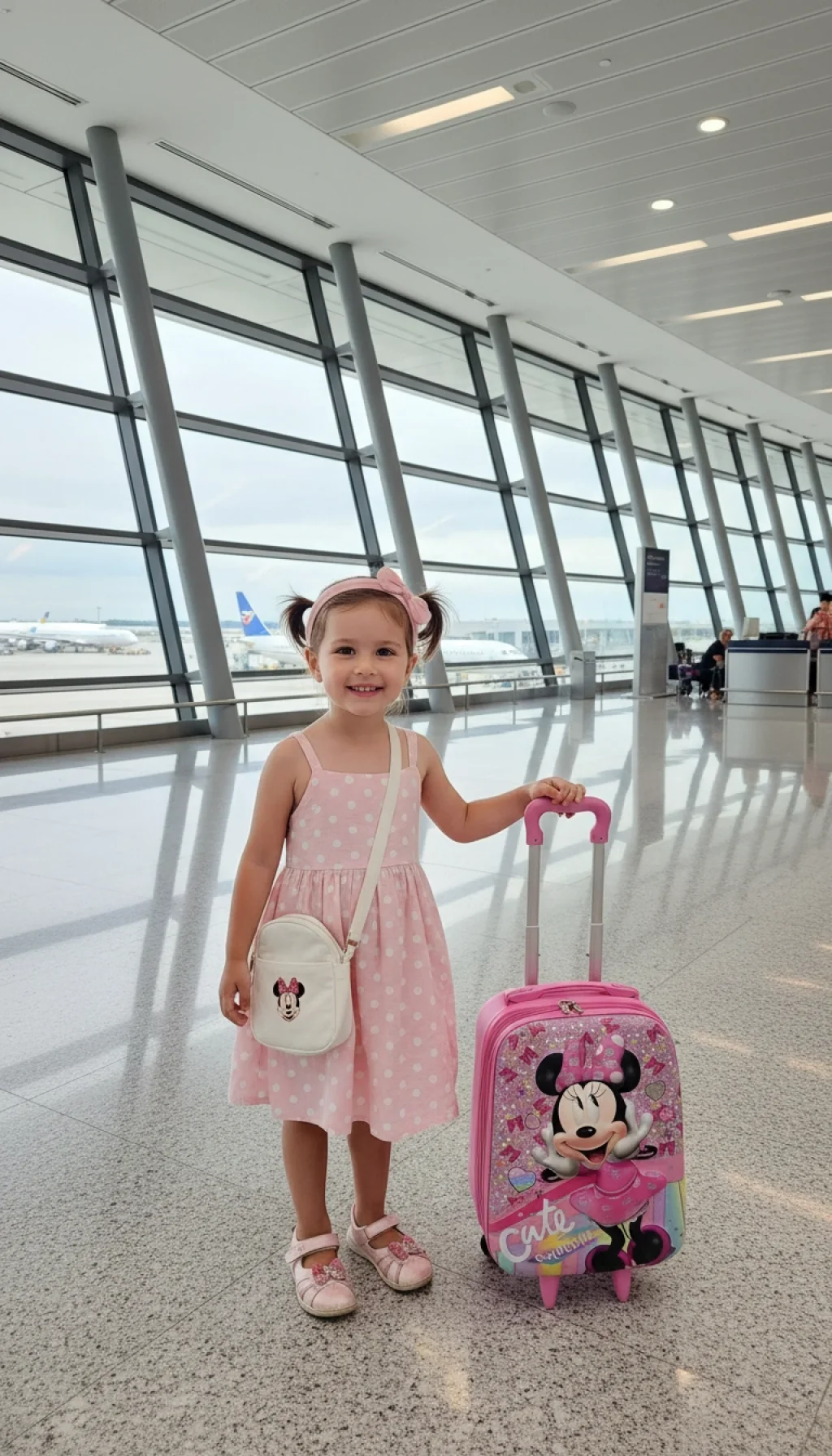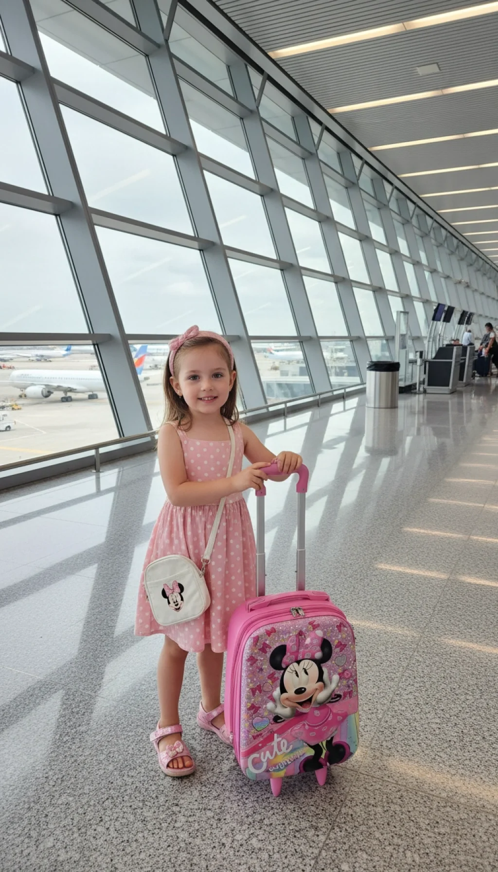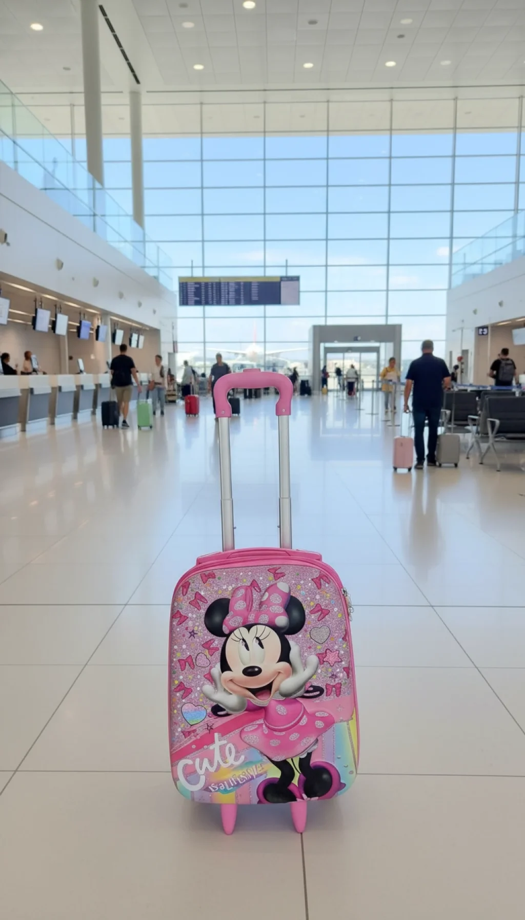 Modayı ve eğlenceyi seven minik gezginler buraya! Nishev koleksiyonunun en neşeli parçalarından biri olan bu Minnie karakterli pembe çocuk valizi, ikonik fiyonkları ve puantiyeli elbisesiyle seyahatlere sevgi katıyor. Gökkuşağı detayları ve ışıltılı yüzeyiyle bu valiz, küçük hanımların vazgeçilmez seyahat aksesuarı olacak.