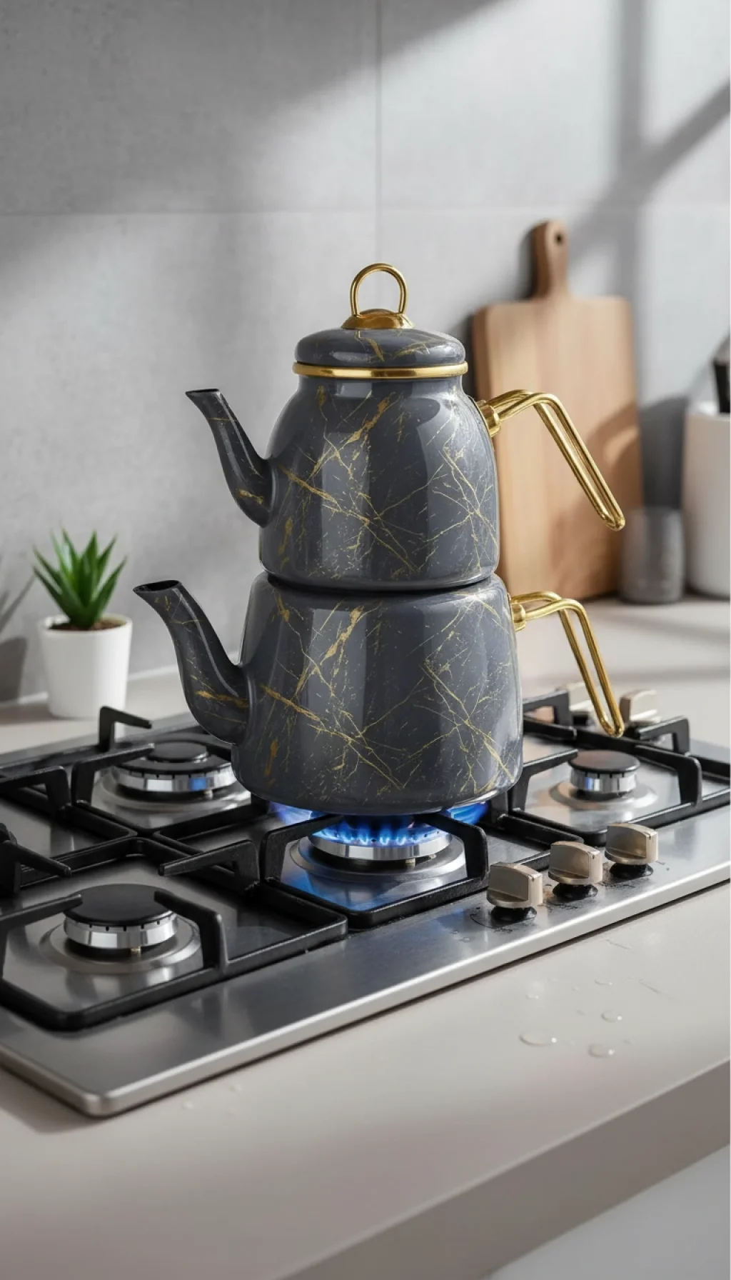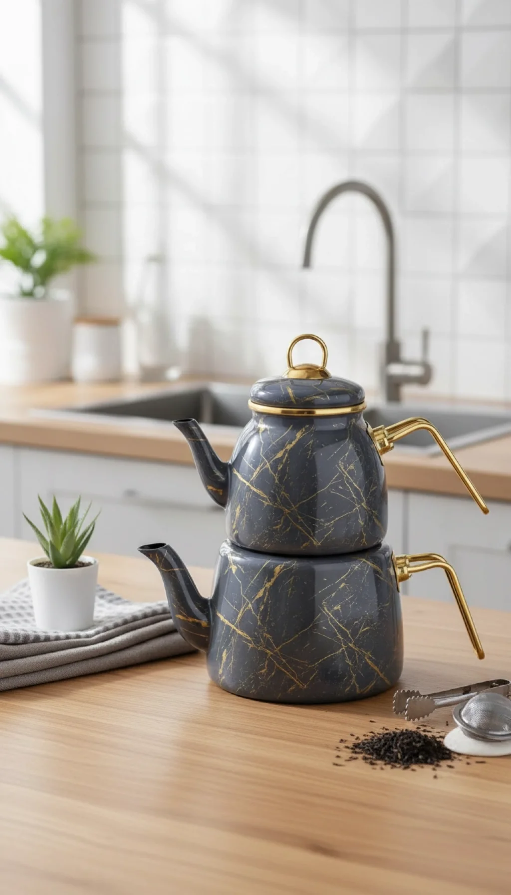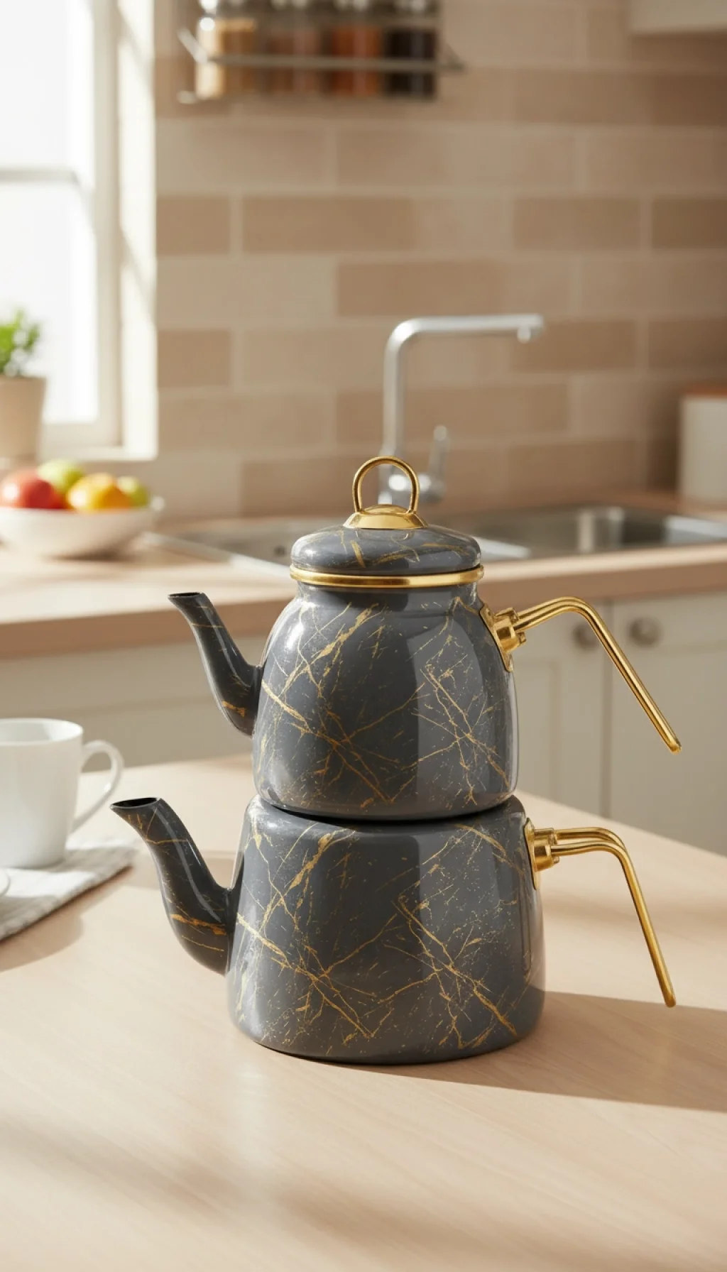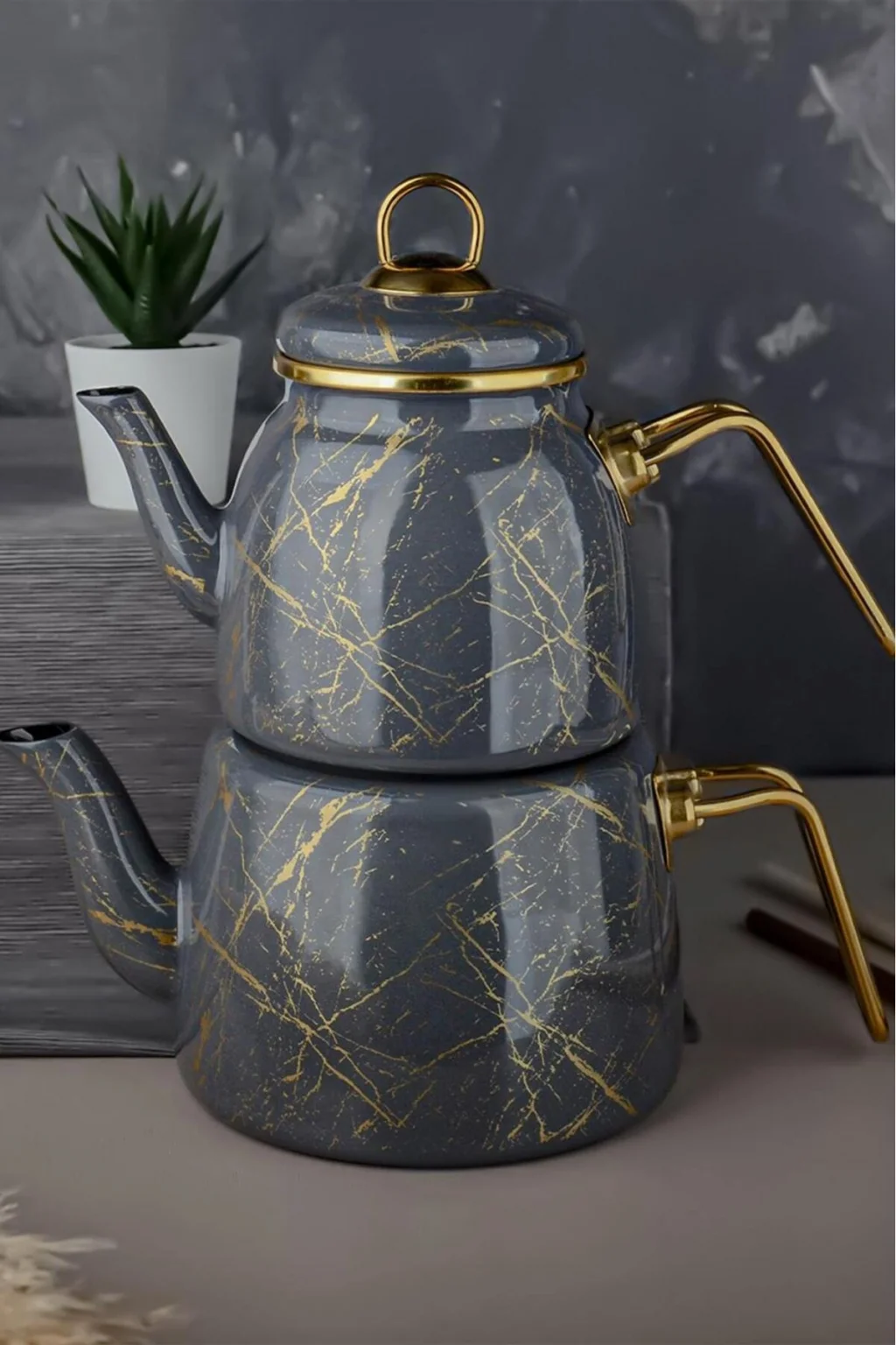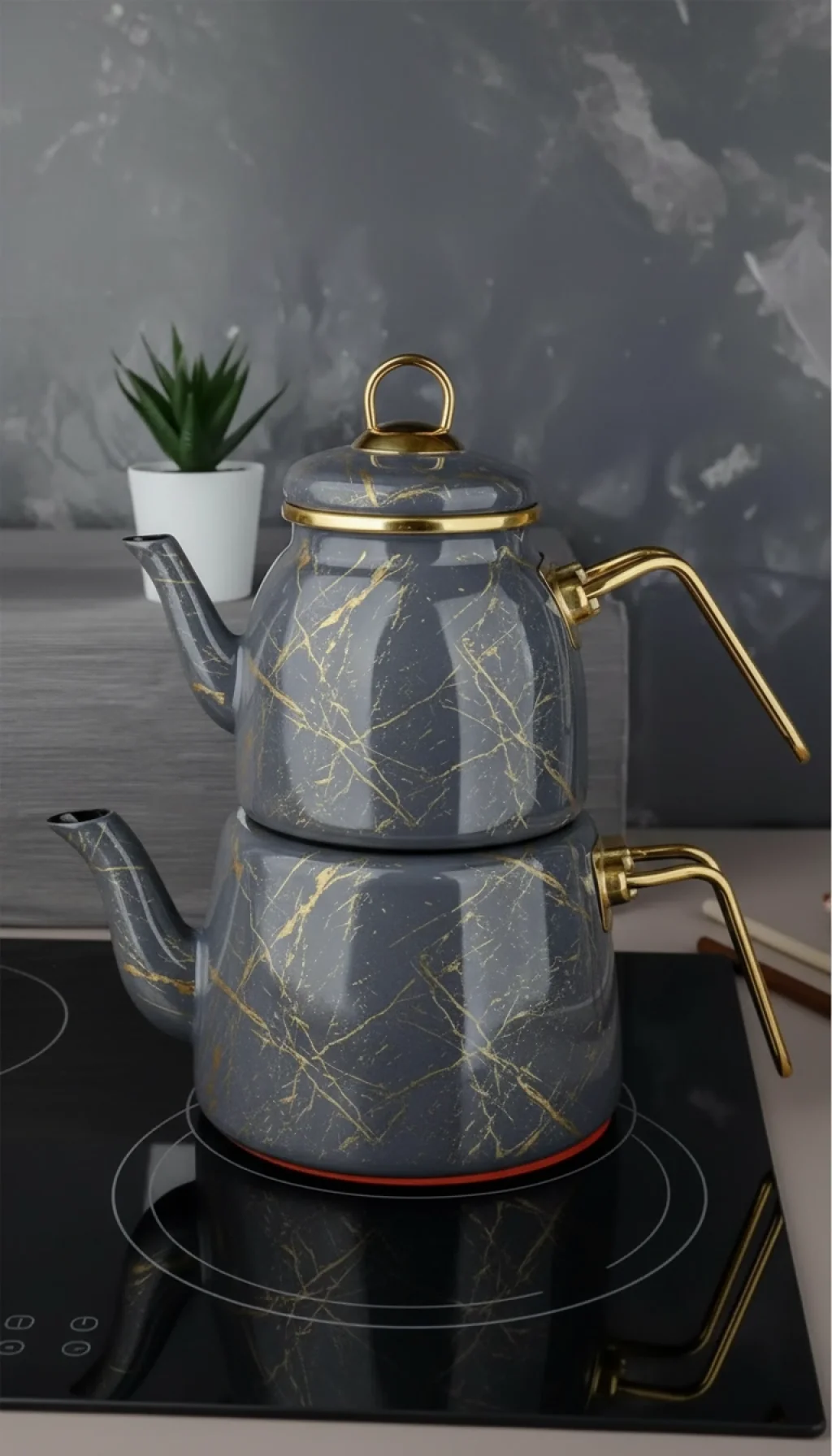 Bu özel tasarım çaydanlık seti, emaye kaplamalı yapısı sayesinde uzun ömürlü kullanım ve kolay temizlik imkanı sunar. Kırık mermer dokunuşu, mutfak dekorasyonunuza lüks ve zarif bir hava katar.
