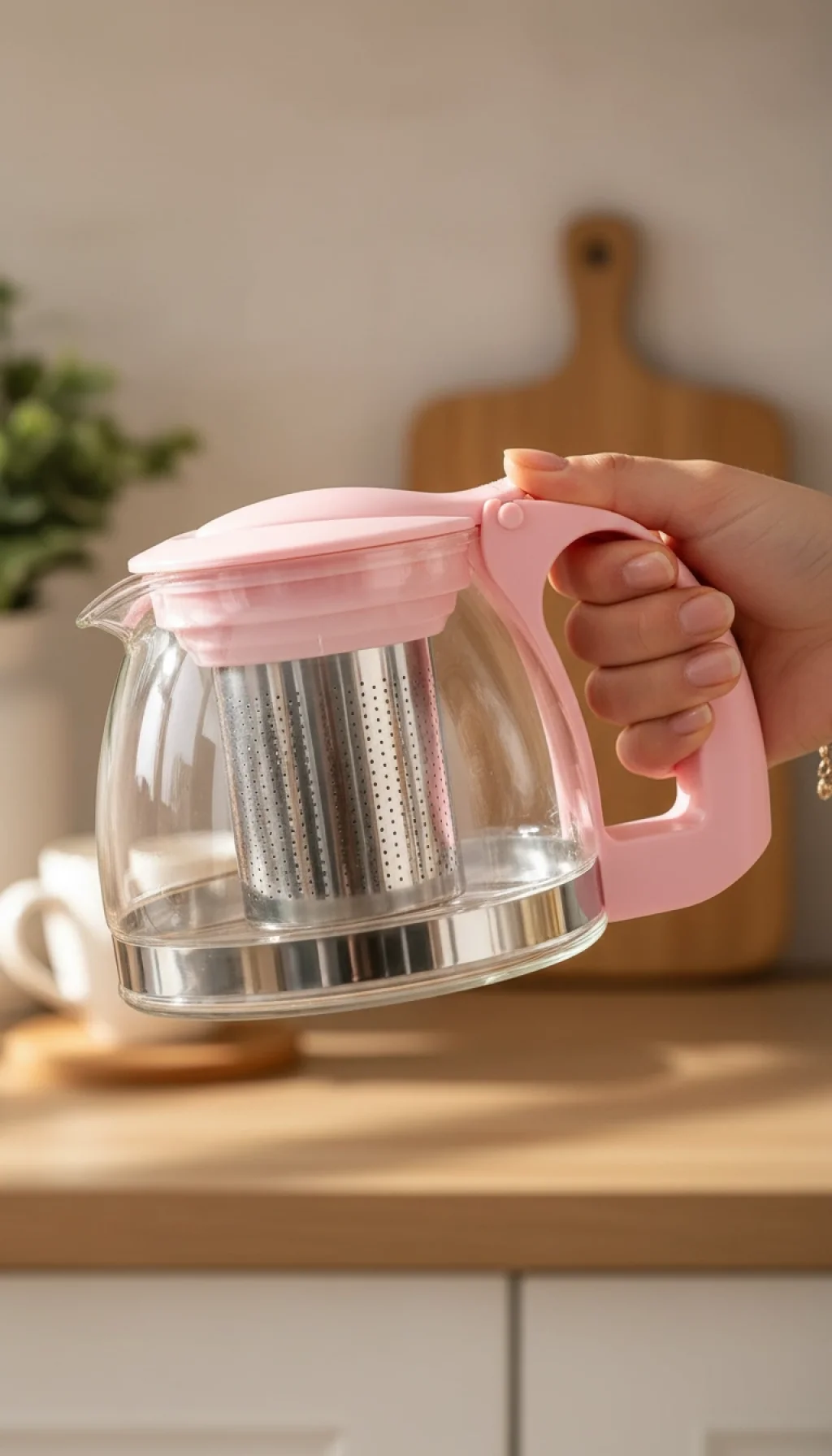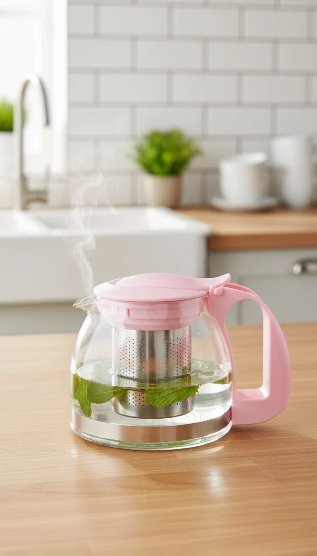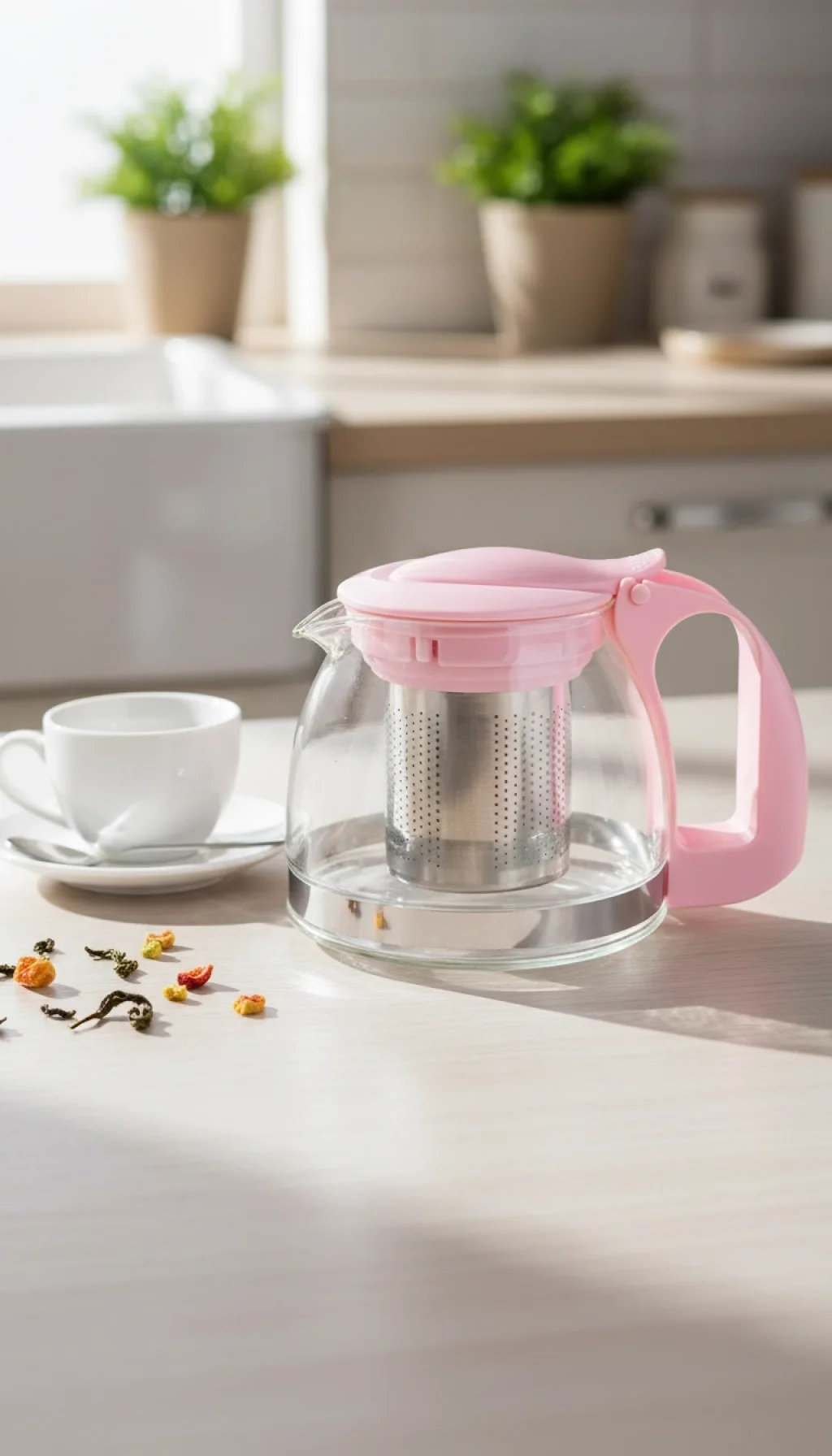 Çay saatlerinize neşe ve zarafet katmaya ne dersiniz? nishev.com koleksiyonunun en sevilen parçalarından biri olan pembe detaylı cam demlik, hem fonksiyonelliği hem de pastel tonuyla mutfağınızın yıldızı olmaya aday.