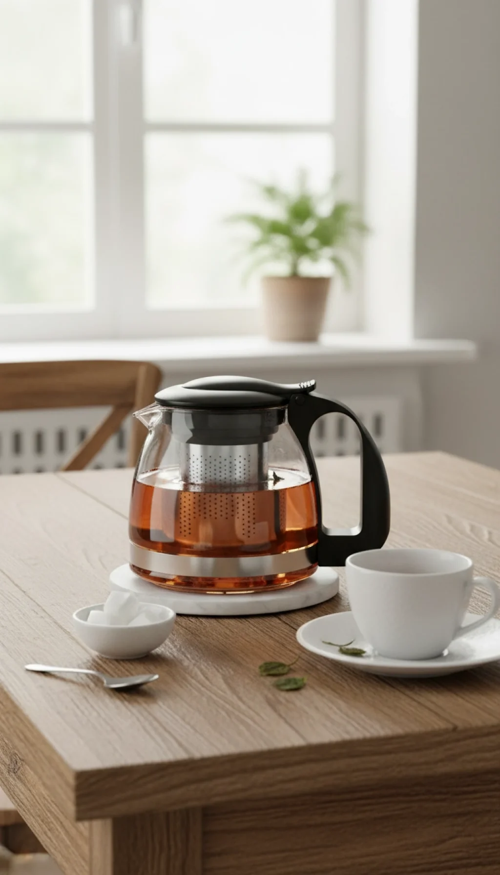- Isıya dayanıklı borosilikat cam gövde, suyun rengini ve sıcaklığını uzun süre korur.