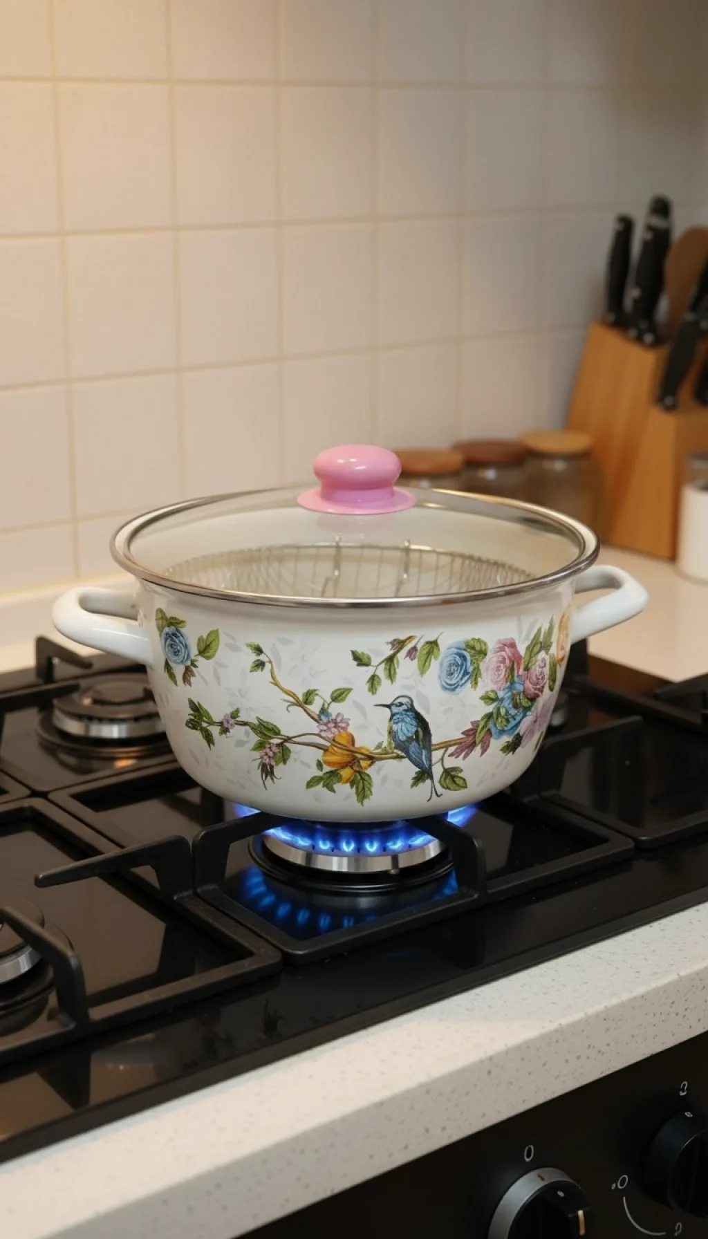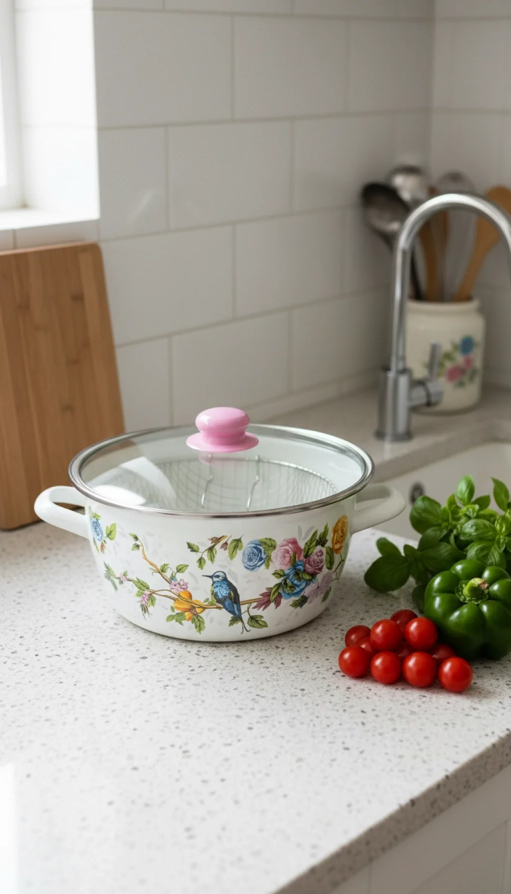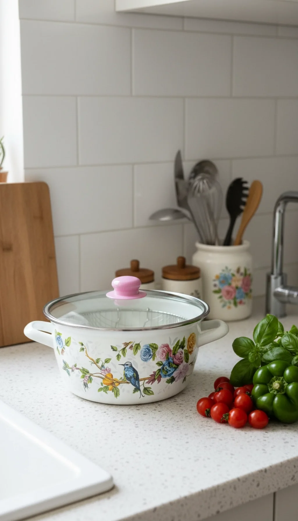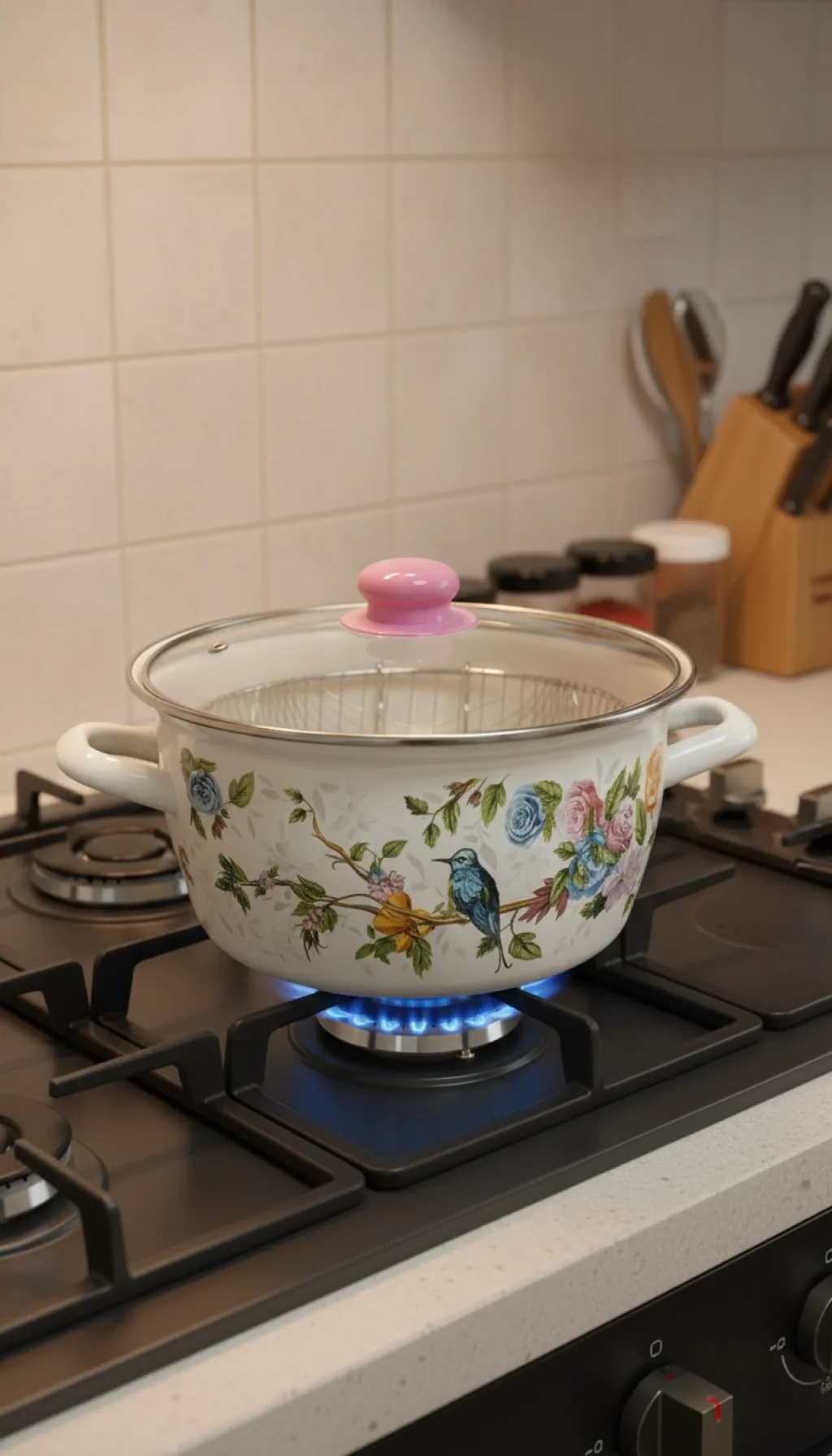 Bu tencere, modern mutfaklar için tasarlanmış şık ve fonksiyonel bir seçenektir. Zarif mavi kuş desenleriyle göz alıcı görünümü, içindeki yüksek kaliteli emaye kaplamasıyla birleşerek hem estetik hem de pratik bir deneyim sunar.