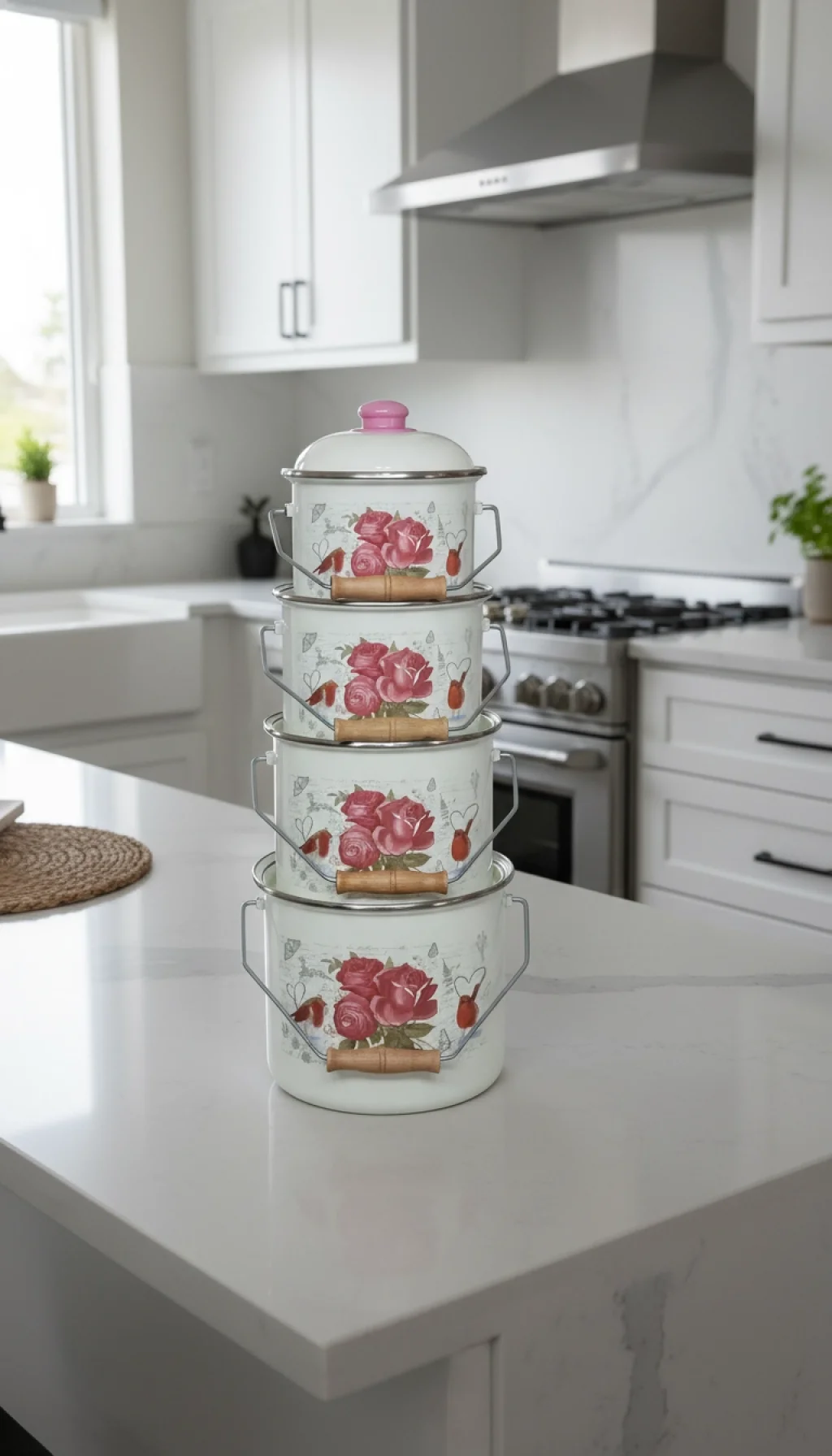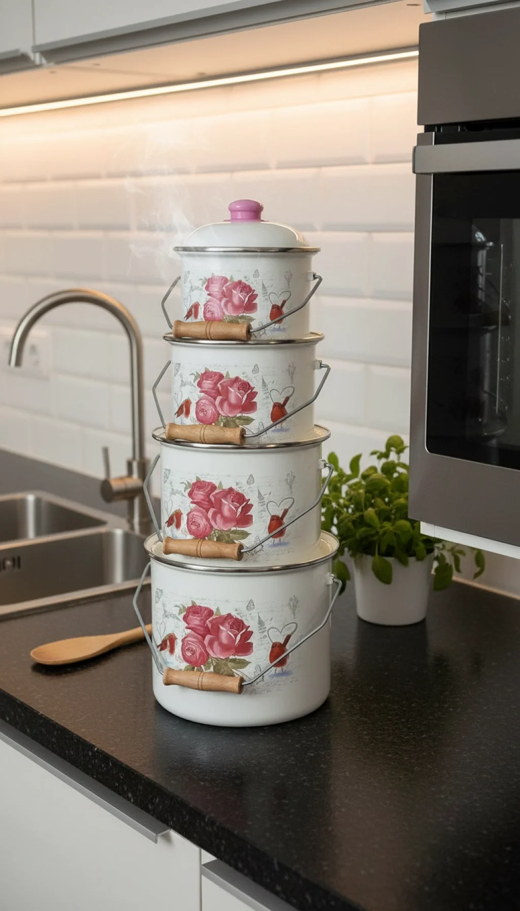 İtalyan Ebru sanatıyla bezenmiş bu özel emaye tencere seti, yoğurt, tahıl ve bakliyat gibi gıdalarınızı en doğru şekilde pişirmenizi sağlar. İnce detayları, zarif renkleri ve dayanıklı yapısı ile mutfağınıza hem şıklık hem de fonksiyonellik katar.